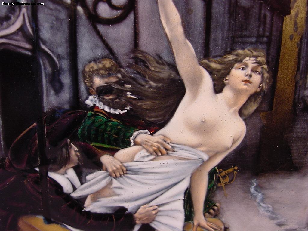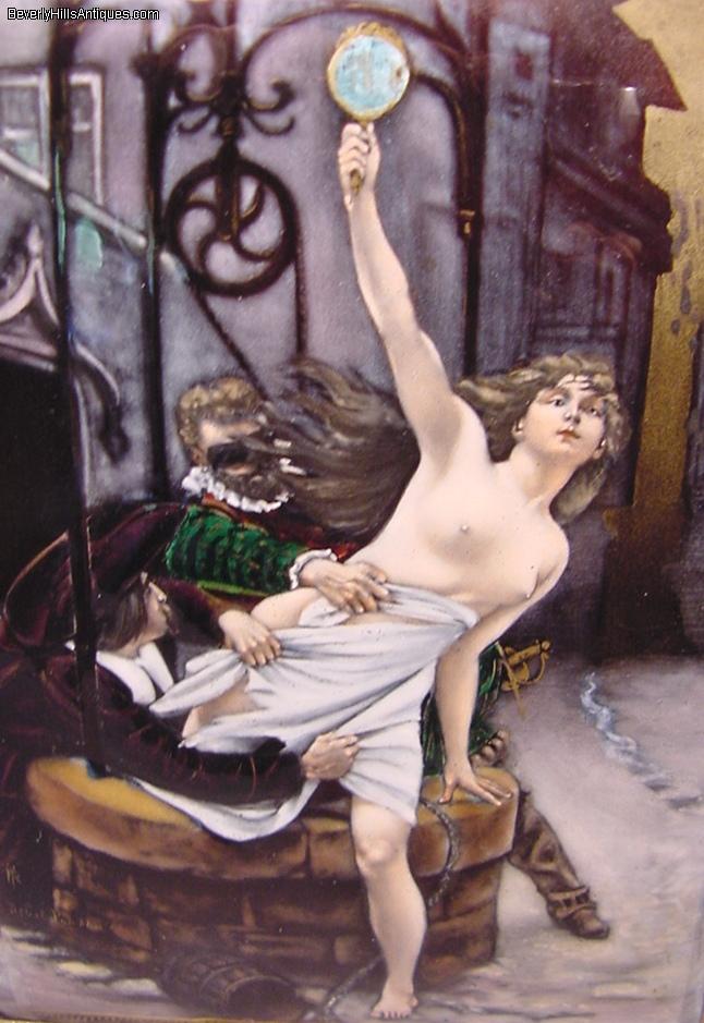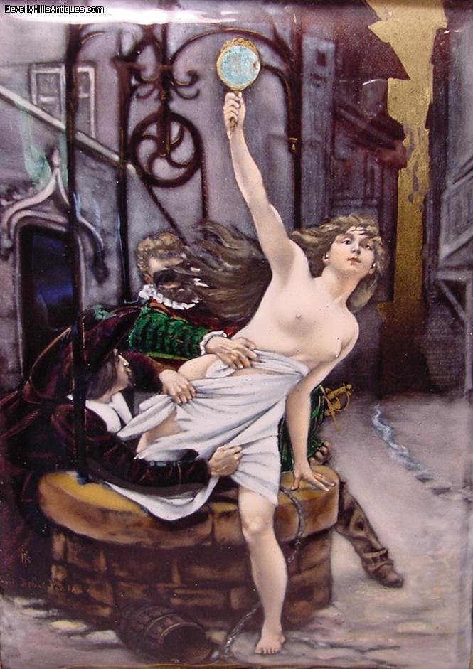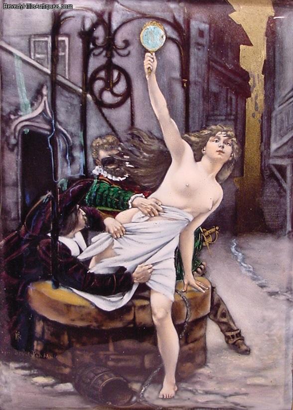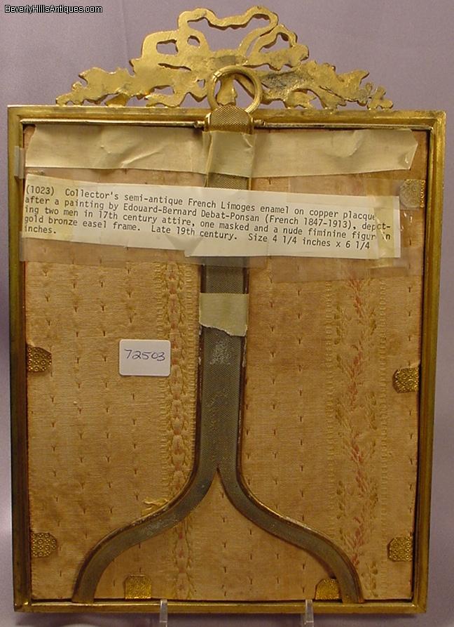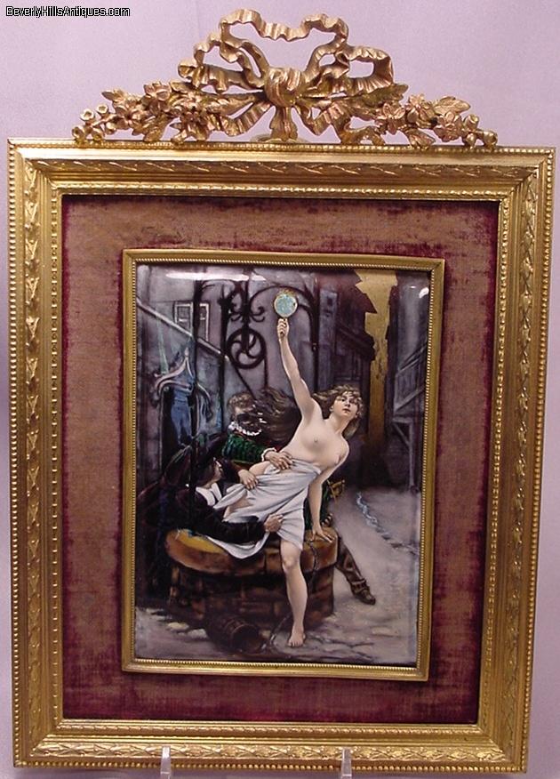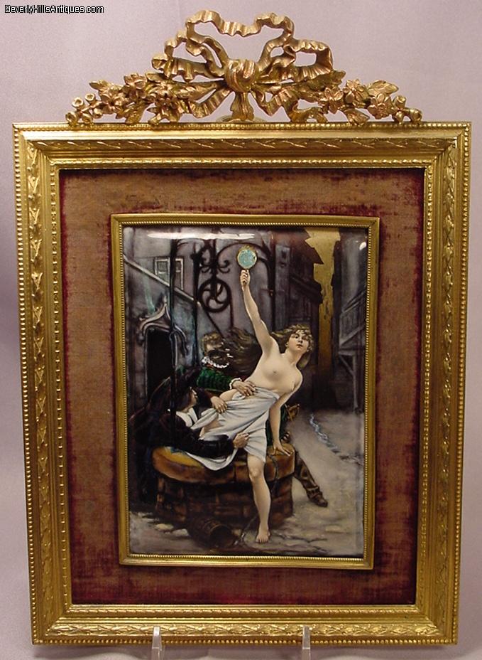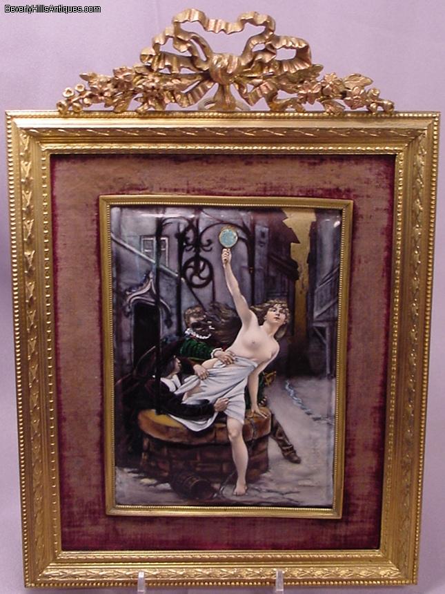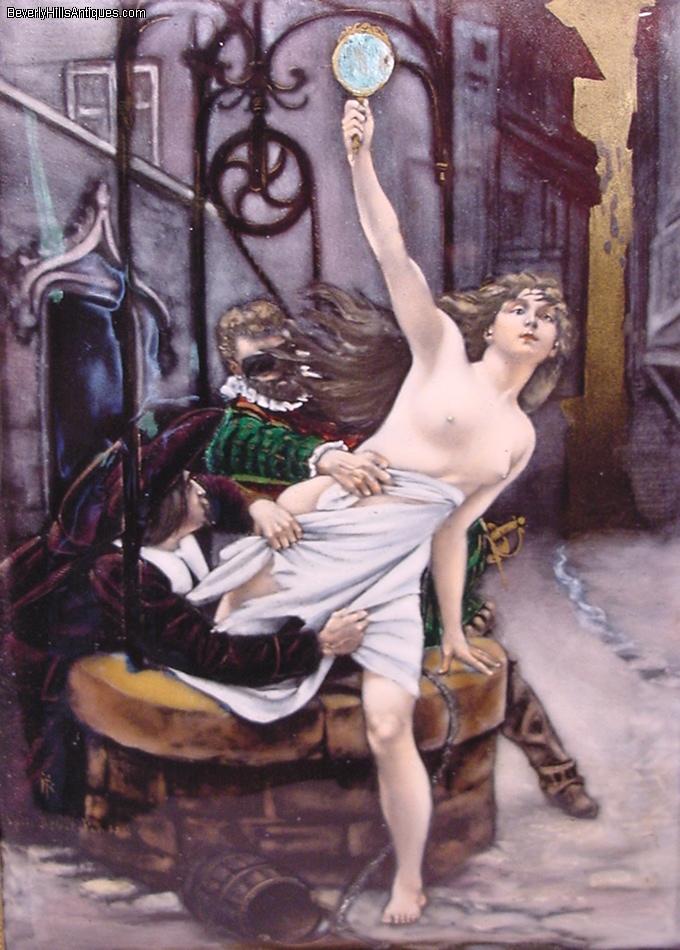 | Exquisite Antique French Enamel Nude Lady Masked Man Artist Signed | | | | | | | Exquisite antique French enamel painting set in its original 19th century frame. The painting depicts a beautiful nude lady holding a mirror in her hand as she is climbing out of a well. The masked man is trying to pull her back while another man in the lower left is trying to pull what little clothing she has off. It is artist signed in the lower left Debat Ponsan. The back of the plaque has some information about the subject. It says "After a painting by Eduard-Bernard, Debat-Ponsan French 1847-1913 The subject depicts 2 men in 17th century attire. One masked and a nude female figure in a gilt bronze easel frame circa late 19th century." The colors and quality of this enamel are extraordinary. It is a very lifelike, beautifully completed composition. It has an easel back as well as the original gilt medal ring allowing it to be hung on a wall or displayed on a desk top. The enamel measures 6 inches high by 4-3/8 inches wide. Framed size 10-1/2 inches high by 7-1/2 inches wide. This is a beautiful objet d'art guaranteed to please the most particular collector or connoisseur. (Item #72503) | | | | | | |  Click image to view larger version