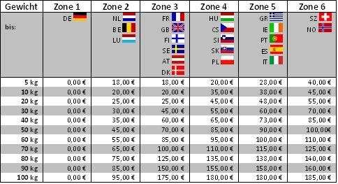 Wir versenden ausschließlich nach Eingang Ihrer Zahlung per DHL. Die nachstehende Liste zeigt Ihnen unsere Versandkosten. Die Versandkosten ergeben sich aus dem Gesamtgewicht aller gekauften Artikel . Der Versand innerhalb von Deutschland ist versandkostenfrei!!!