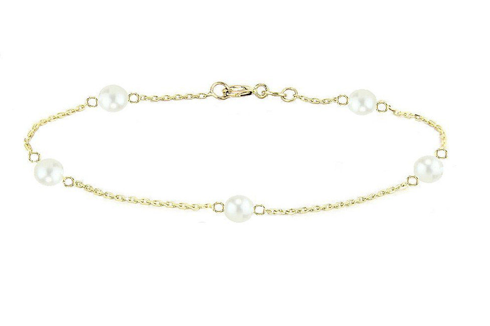 14K Yellow Gold Station Anklet Bracelet With Freshwater Pearls 10.5 Inches