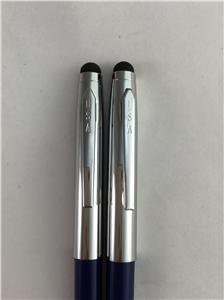 NEW 2 PACK USA BLUE/SILVER BARREL PEN/STYLUS COMBO. BLACK INK. USA IMPRINTED ON THE PEN CLIP