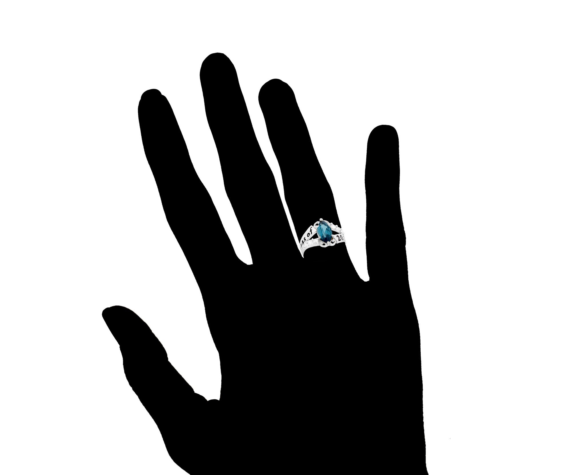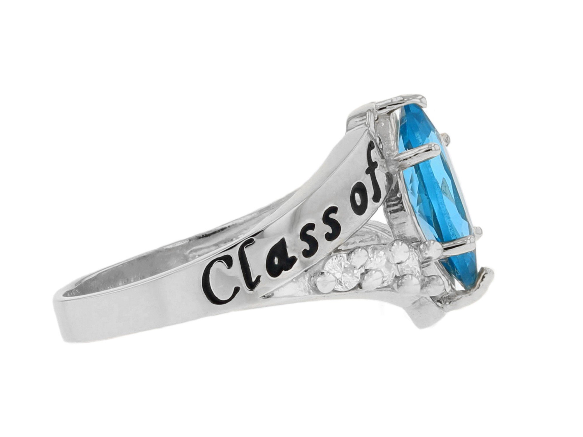 An exquisite Marquise Simulated Blue Zircon gem is prong set atop a gorgeous band in this Class of 2026 graduation ring. Brilliant white CZ are set on a split shank on either side of the center stone and create a glow that will entrance onlookers. Only fine 10k or 14k White Gold is used to craft this fine piece of jewelry. Show that graduate in your life how important their milestone is with this elegant graduation ring. Blue Zircon is the birthstone for the month of December and stands for success, love, luck, happiness and prosperity. Our rings are proudly handcrafted in our California factory.