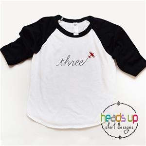 This adorable "Airplane Three" shirt is perfect for your little one. Could be used to celebrate a milestone 3rd birthday, for a photo session to document their age, or wear it on any day! It also makes a great gift! It is made using high quality heat transfer vinyl and comes on a white/black shirt.