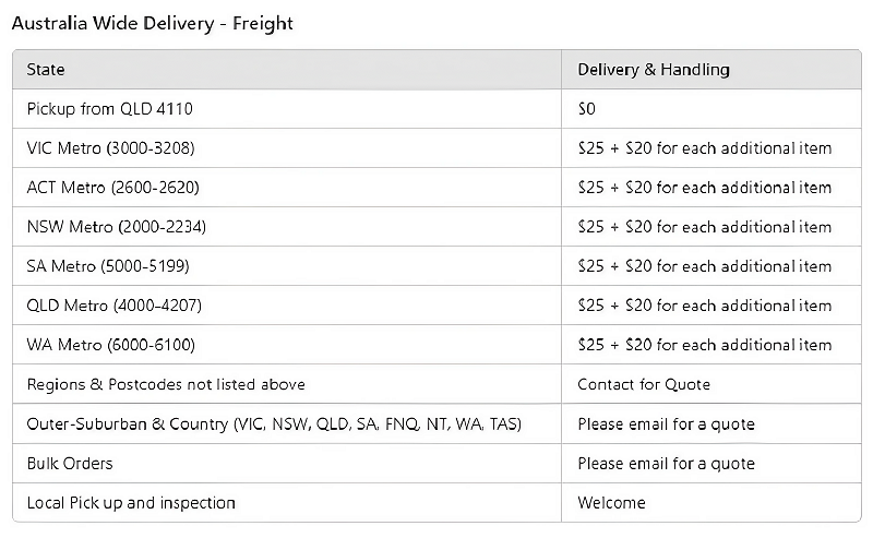 If your order is placed from an area outside capital cities or large regional centers, we reserve the right to contact you and confirm the final delivery cost. Please refer to the postcode table for any areas that may incur extra charges.