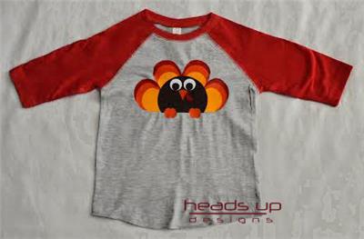 This adorable Turkey shirt is perfect for your little one. It also makes a great gift! It is made using high quality heat transfer vinyl and comes on a gray/red shirt.