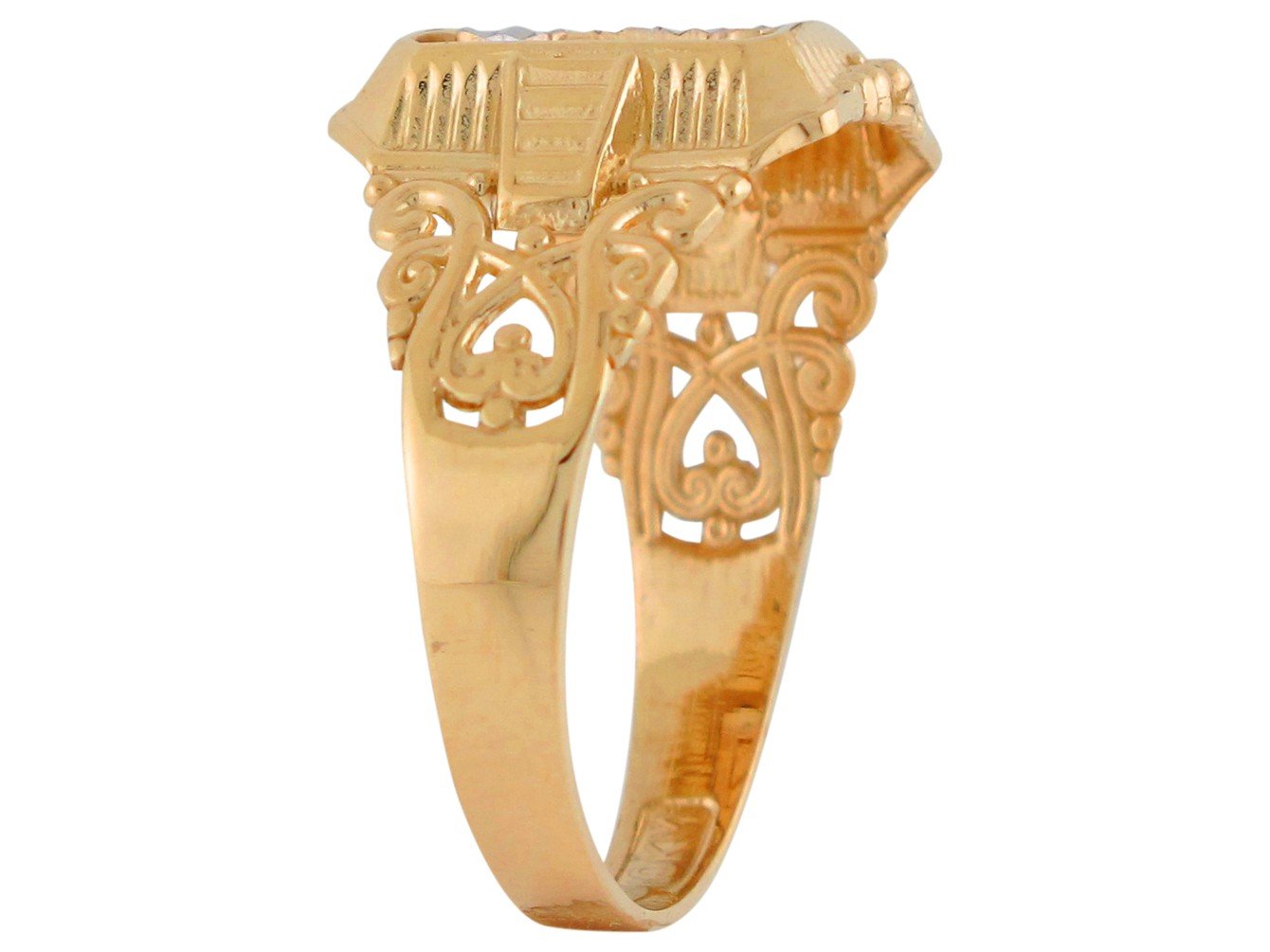 This impressive initial ring for men features a bold design that incorporates a highly detailed pattern along the top of the piece. A single Two-Tone Letter G is present at the center of the ring and features Diamond cuts that are sure to get you noticed! A filigree design is present on the shanks of the piece, adding the final touch that makes this a must have for any collection. Only fine 10k or 14k Two-Tone Gold is used to bring this ring to life. A high polish finish is given to the piece to create a mirror-like finish that is sure to turn heads wherever you go. Our rings are proudly handcrafted in our California factory.