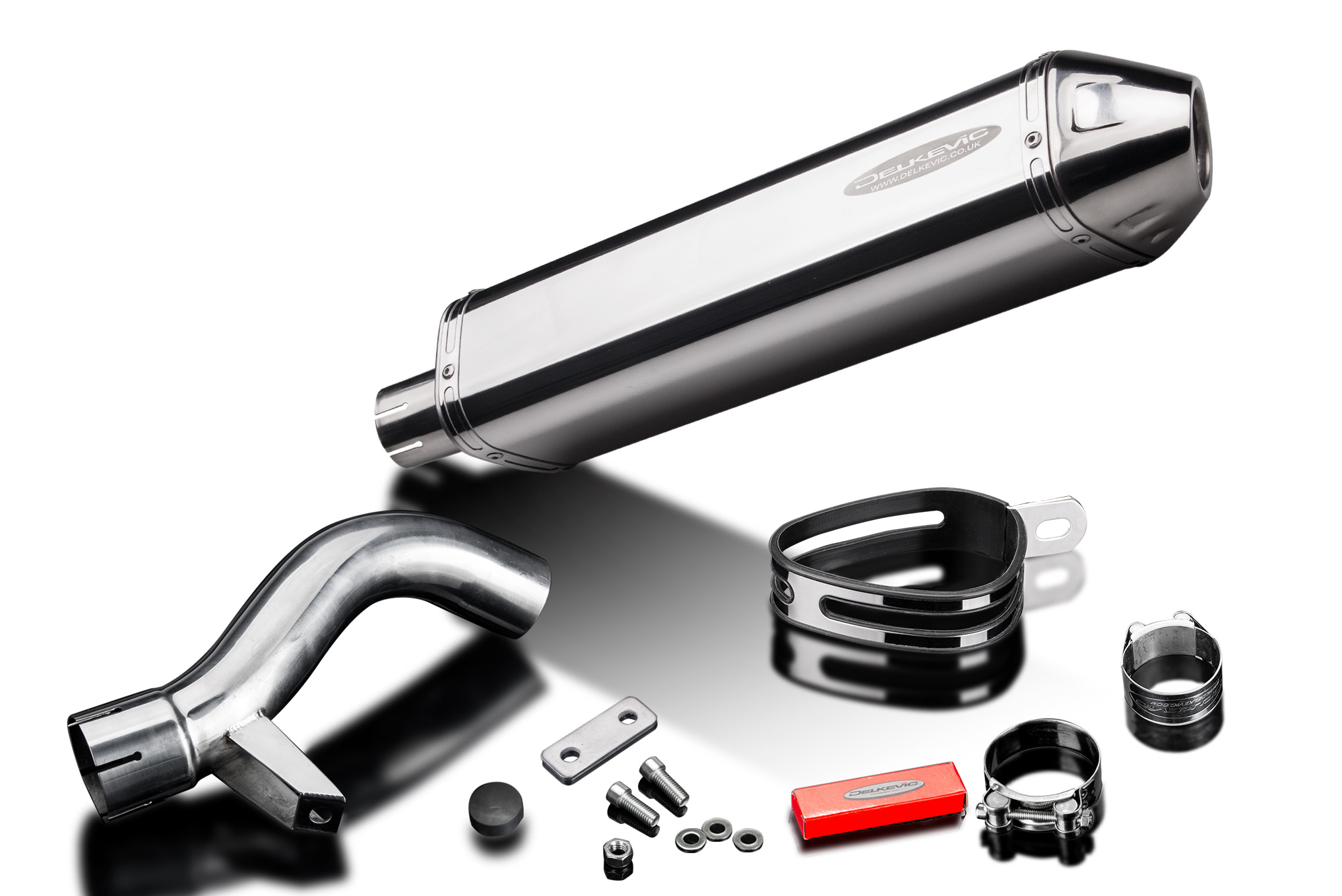 Delkevic slip-on muffler, link pipe, strap, and clamps