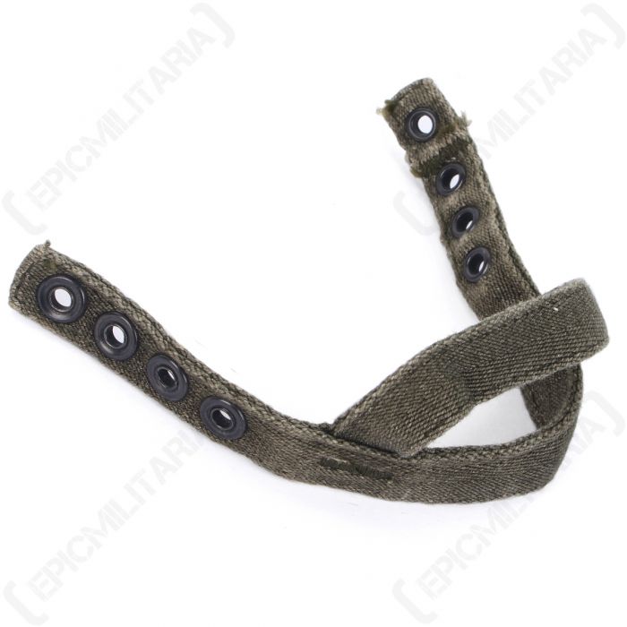 These are post-war surplus American Paratrooper helmet chin straps in a lightweight yet durable canvas. The straps have a shaped middle to comfortably fit over the wearer's chin. There are four metal-capped eyelets at each end to allow the strap to be fitted to an M1 helmet.