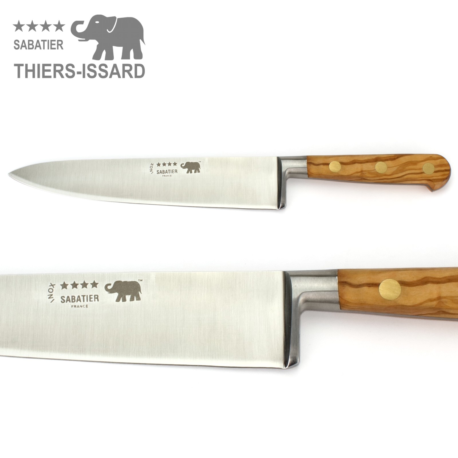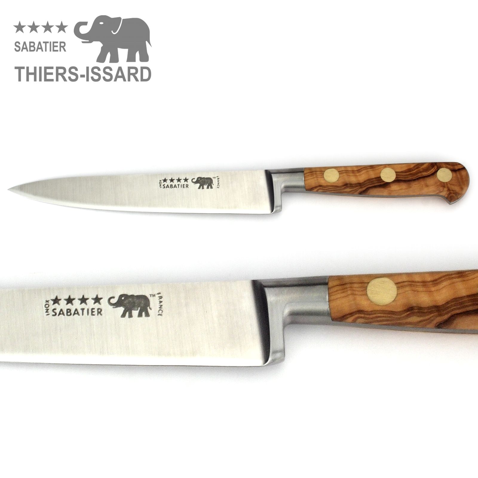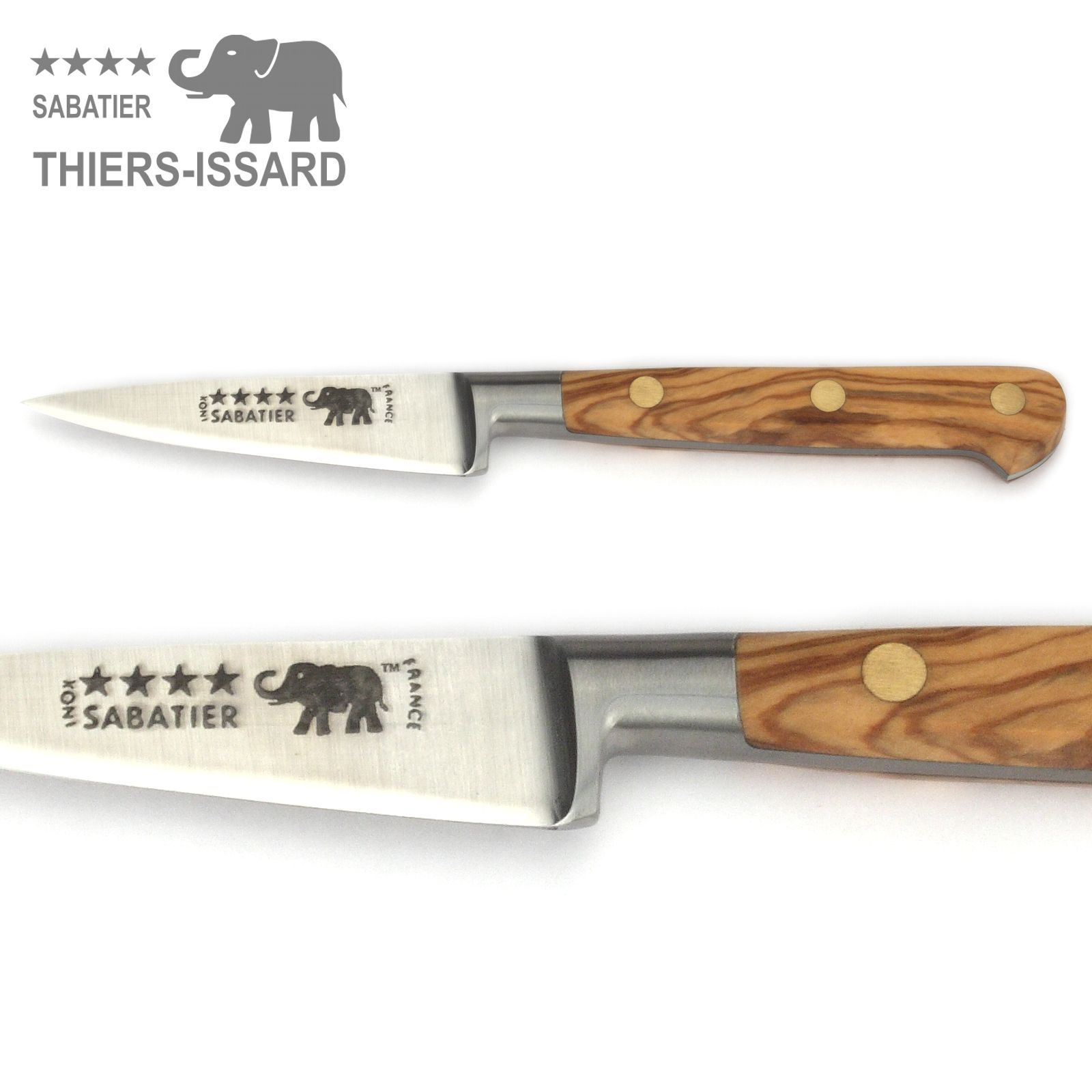 Edles Messer-Set mit 5 Sabatier Küchenmessern von Thiers-Issard mit Griffschalen aus schön gemasertem Olivenholz.