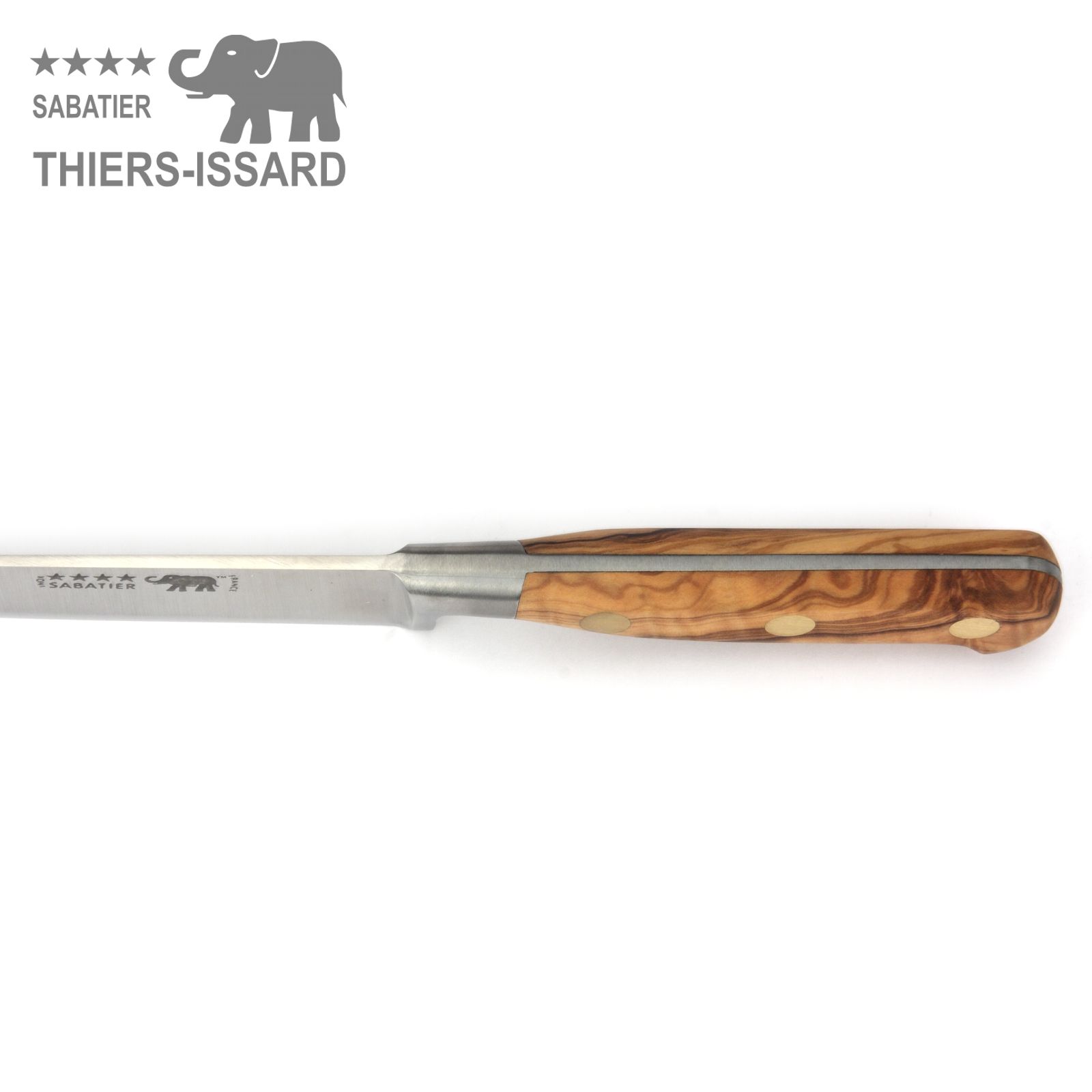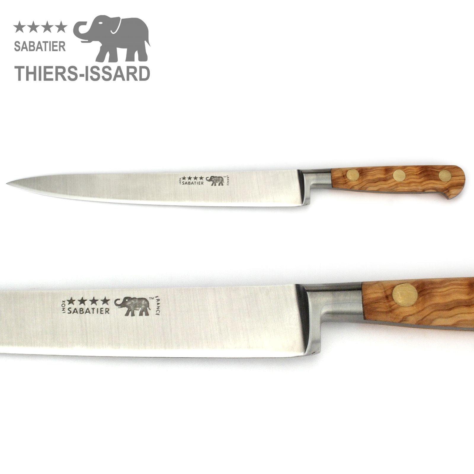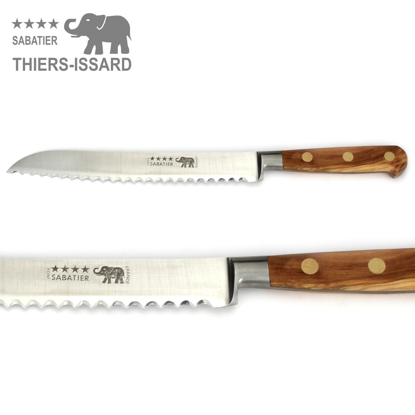 Edles Messer-Set mit 5 Sabatier Küchenmessern von Thiers-Issard mit Griffschalen aus schön gemasertem Olivenholz.