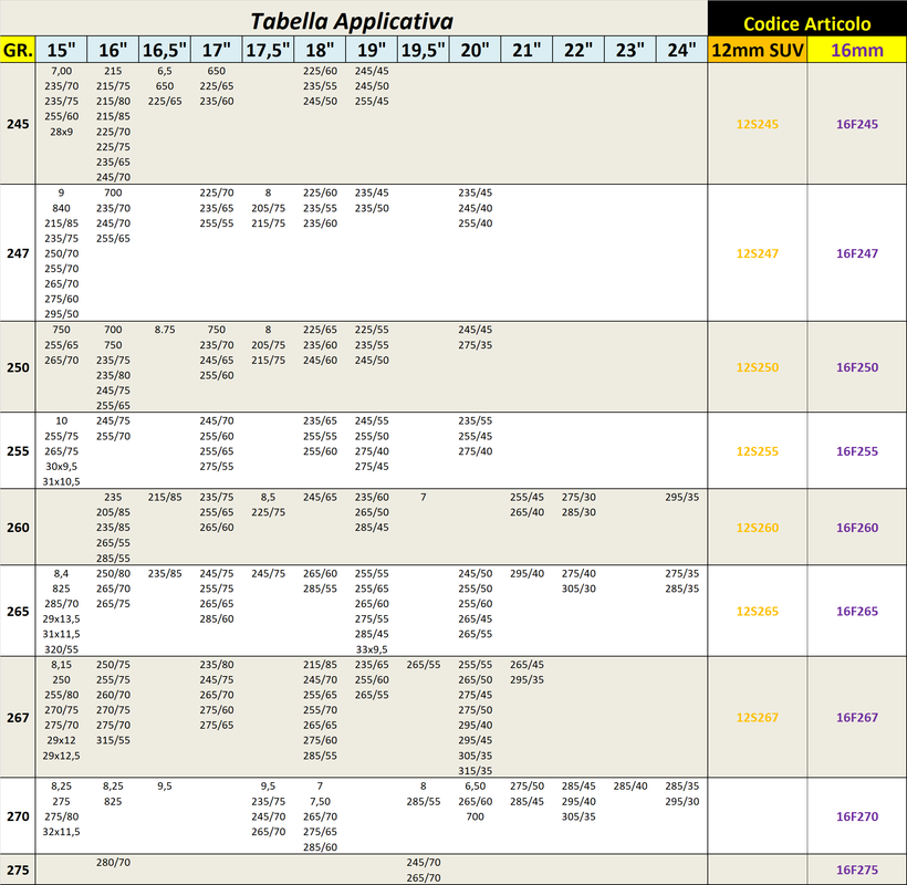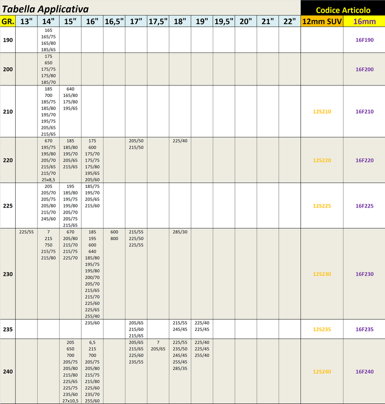 Compatibili con una vasta gamma di misure di pneumatici, le catene da neve GRIPX sono una soluzione affidabile per affrontare le strade innevate. Consultare sempre il manuale uso e manutenzione del veicolo per verificare la Catenabilità con il gruppo di appartenenza nella tabella sottostante.