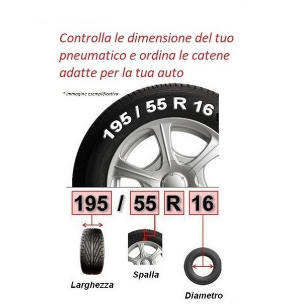 Prima di procedere con l'acquisto delle tue catene da neve GRIPX verificare sul proprio pneumatico la misura adatta per la propria vettura. Il primo numero indica la larghezza del proprio pneumatico, il secondo numero indica la spalla e il numero finale finale indica il diametro.
