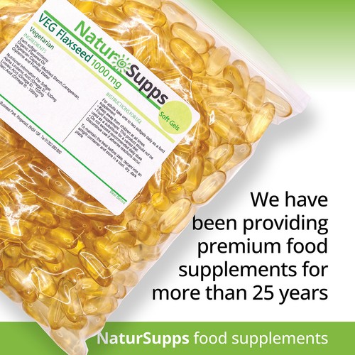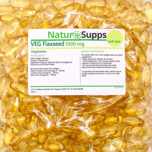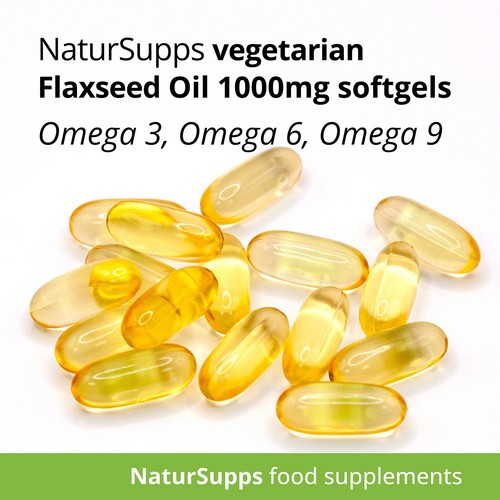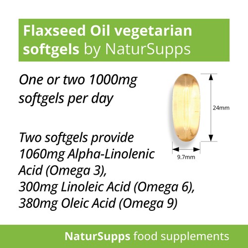 Vegetarian & Vegan Flaxseed Oil, Omegas 3, 6 & 9, in 1000mg softgel capsules.
