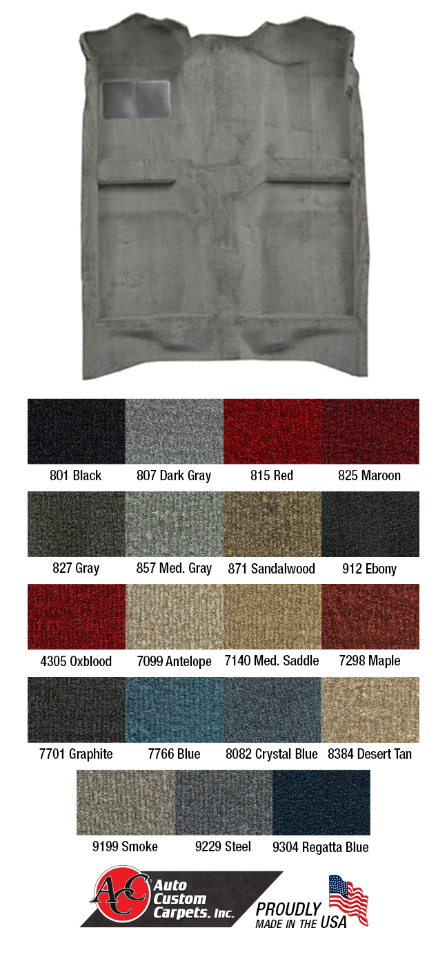 Description: Complete original style passenger-area carpet for 1982 - 1993 Fox Body Coupe or Hatchback Mustangs. Carpet is proudly made in the USA by Auto Custom Carpets, Inc. (ACC). Also available with Mass Backing. See eBay number 174297538688. Please note that we cannot ship these to a PO box, so please provide a physical address.