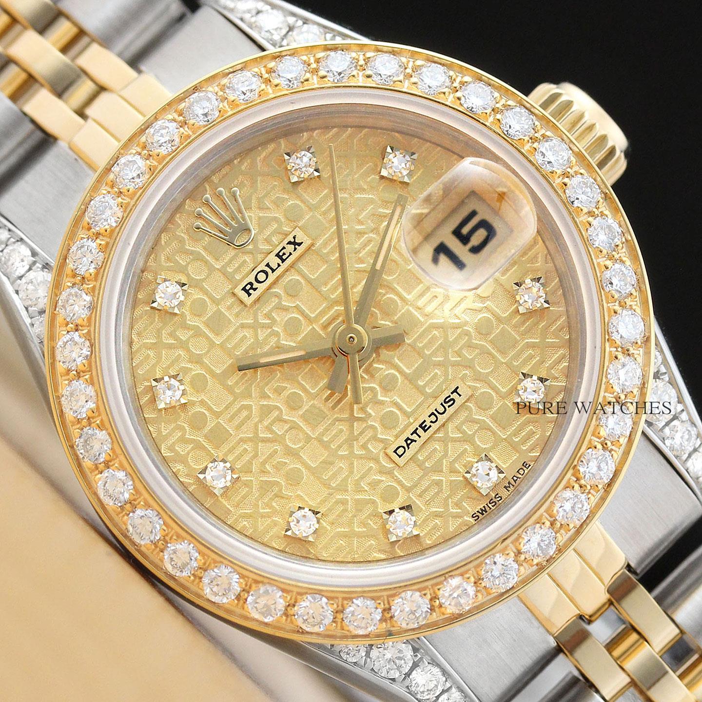 This is an authentic Rolex Datejust 69173 watch with Rolex 18K yellow gold and stainless steel jubilee band, factory Rolex jubilee diamond dial, custom 18K yellow gold diamond bezel, and added diamonds on the lugs.