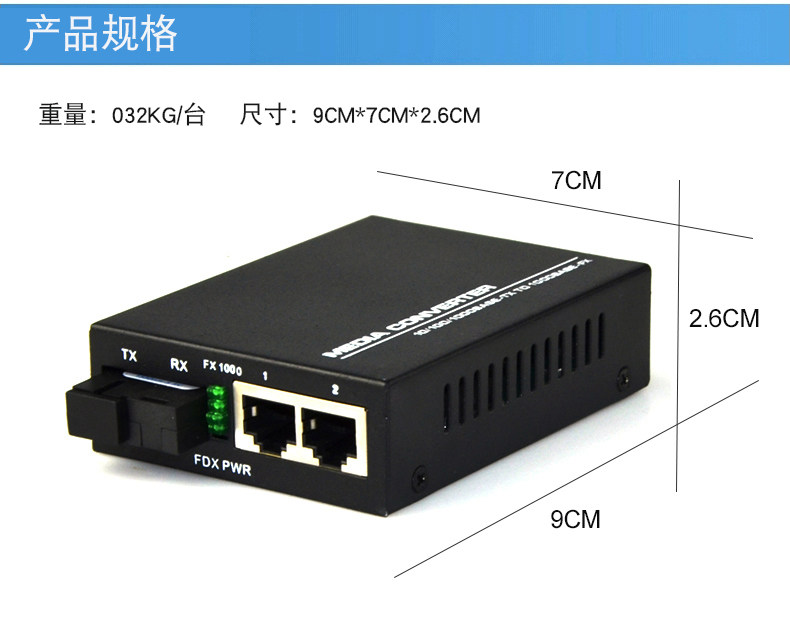 it has the similar functions as normal fiber media converter, when you use the converter,all the data from different ports can be shared, realize the data sharing.It is suitable for intelligent community, it extend the network transmission from100m to 120km. Also it can be realize the interconnection between motherboard server, Repeaters, hubs, switches, terminal.Plug and play design makes easy installation, no on-site adjustment, All the light, electricity interfaces are in line with international standards, products applicable to different harsh industrial environment. The installation and operation procedures of the Fiber Optic Media Converter are simple and straight forward. Operation status can be monitored through a set of Diagnostic LED located in the front panel. Since the data rate is auto-negotiated, no internal adjustments or setting are necessary. Standard shielded RJ-45 connectors are provided for Cat. 5 compliance.