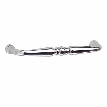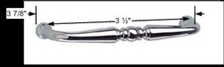This chrome pull has a 3 1/2" boring and it projects 1 1/4". The slim and delicate shape attaches to the drawer from a solid circle backing 1/4" in diameter and the pull itself is 1/4" wide. It is 3 7/8" long, making it slightly bigger than 19281. It includes (2) 1 1/4 x 8-32 roundhead machine screws. Base washers are not included.