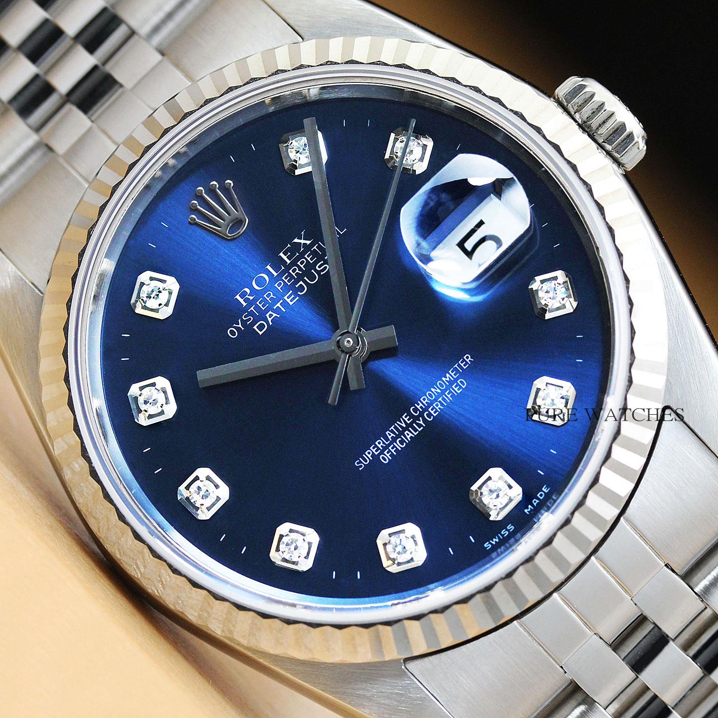 This is an authentic Rolex Datejust 16234 watch with Rolex stainless steel jubilee bracelet, Rolex 18K white gold fluted bezel, and Rolex dial Ref. with added custom diamond markers.