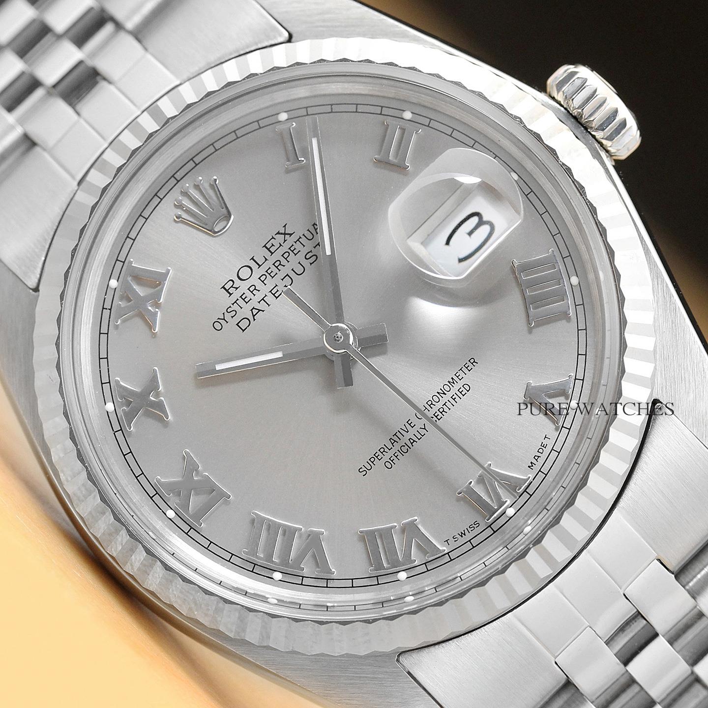 This is an authentic Rolex Datejust 16014 watch with Rolex 18K white gold fluted bezel, Rolex dial Ref. with added roman markers, and custom stainless steel jubilee bracelet.