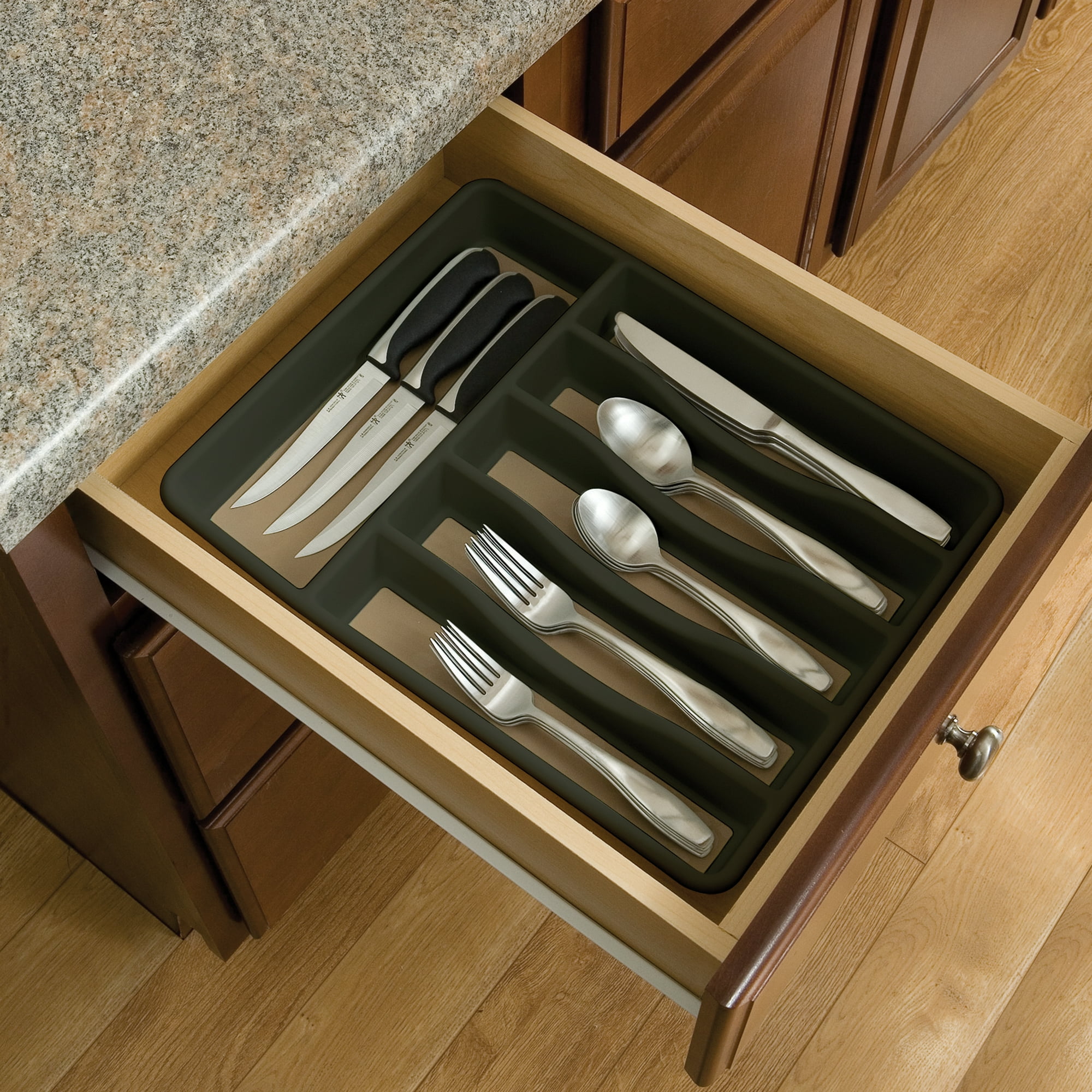Organize your cutlery (knives, spoons and forks) with the Rubbermaid No Slip Cutlery Tray. The tray has special feet and bottom that keeps it from sliding around your drawer when it opens in closes.