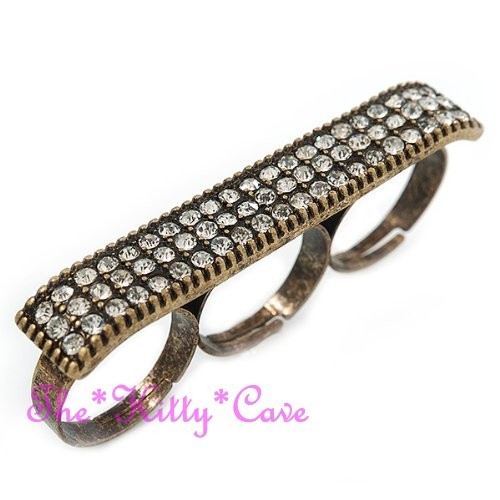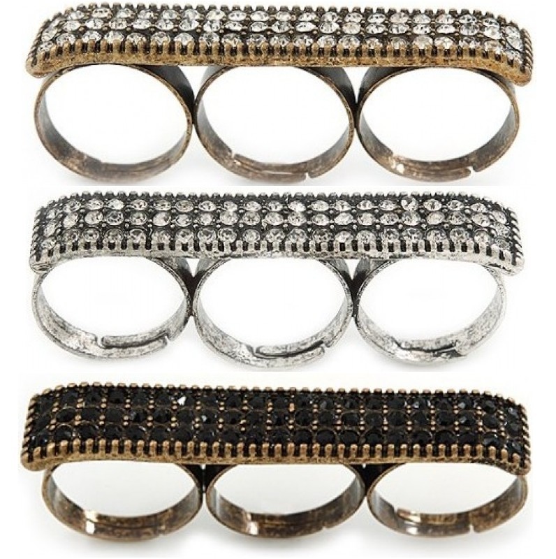 Rock into the diva you were born to be as you wear this bold masterpiece. Add a little fun to your look with this pave set 'Plate' three finger ring in vintage burnt Gold or aged Silver metal.
