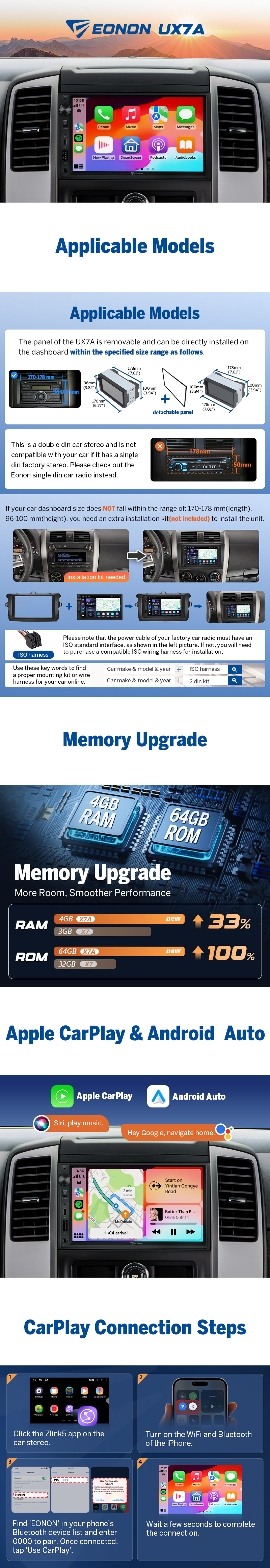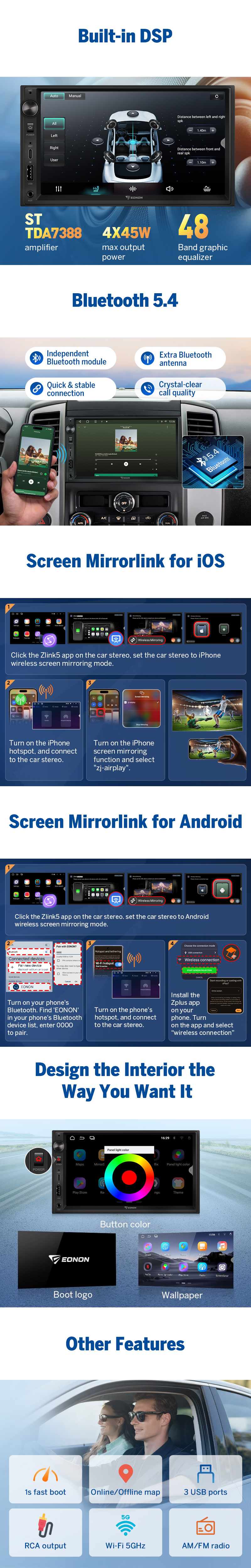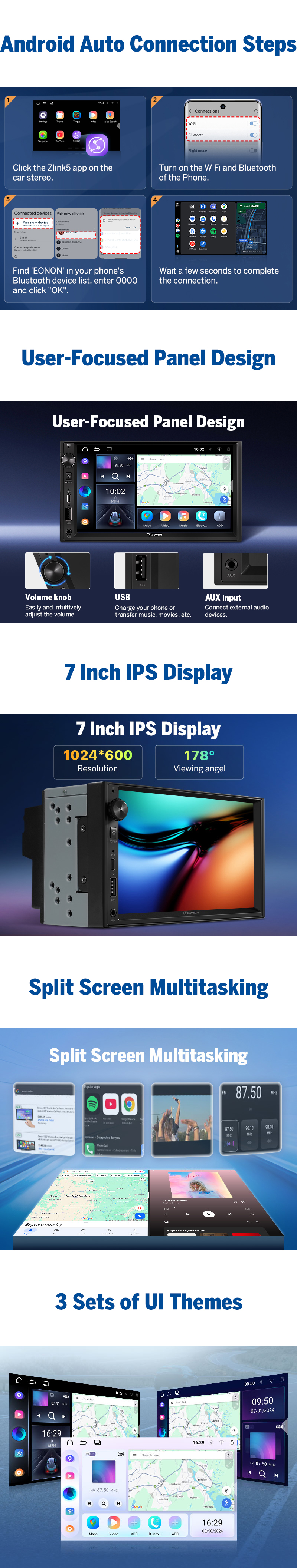 Upgrade your vehicle with the Eonon UX7A, a universal 7" double DIN Android 14 head unit designed for precision, premium audio, and safer driving. Transform your dashboard into a smart, connected hub with hands-free control, offline navigation, multi-tasking, and OTA updates—without sacrificing factory functionality.