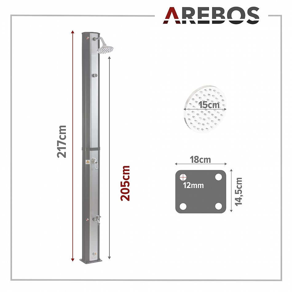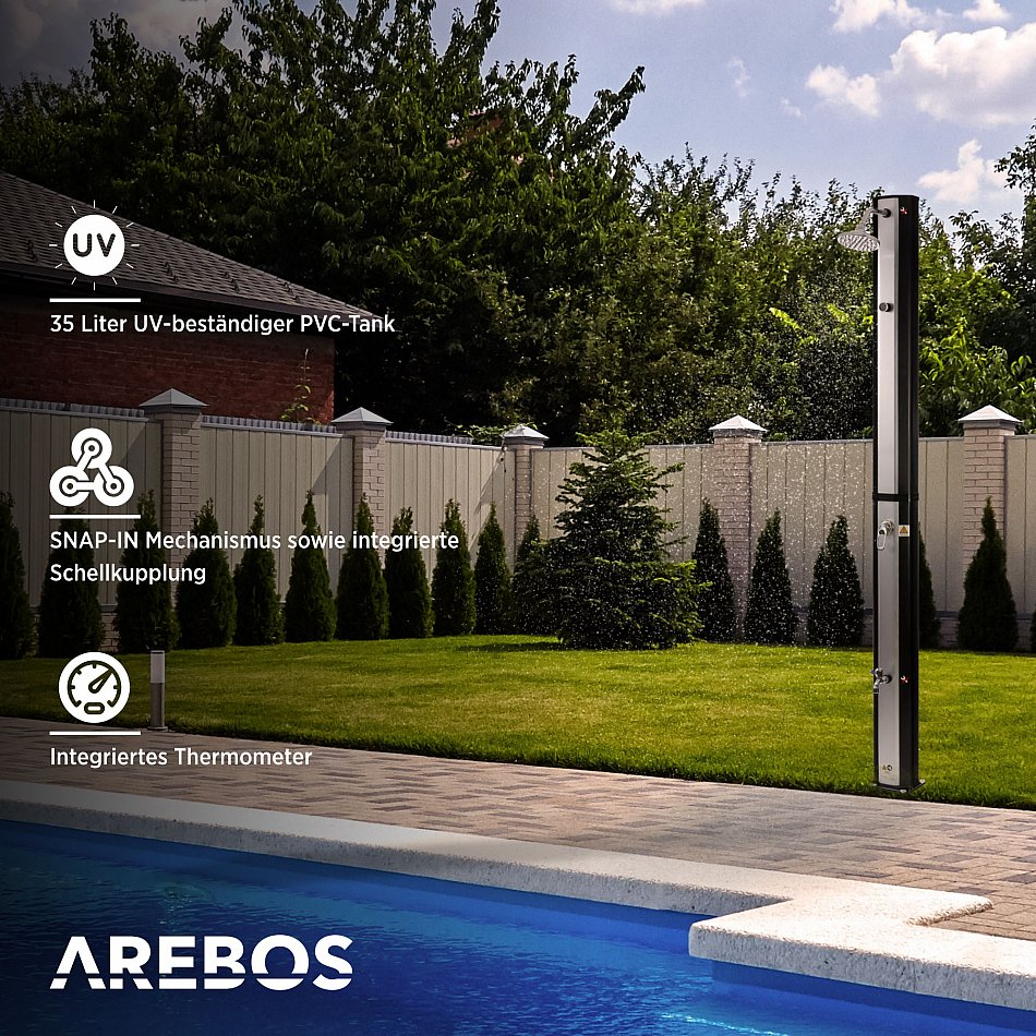 [UMWELTSCHUTZ & UMWELTBEWUSSTSEIN] Die AREBOS Solarduschen schonen Ihren Geldbeutel, da sich das Wasser durch die Sonneneinstrahlung, die vom Korpus absorbiert wird, erhitzt. Keine zusätzlichen Energiequellen notwendig.