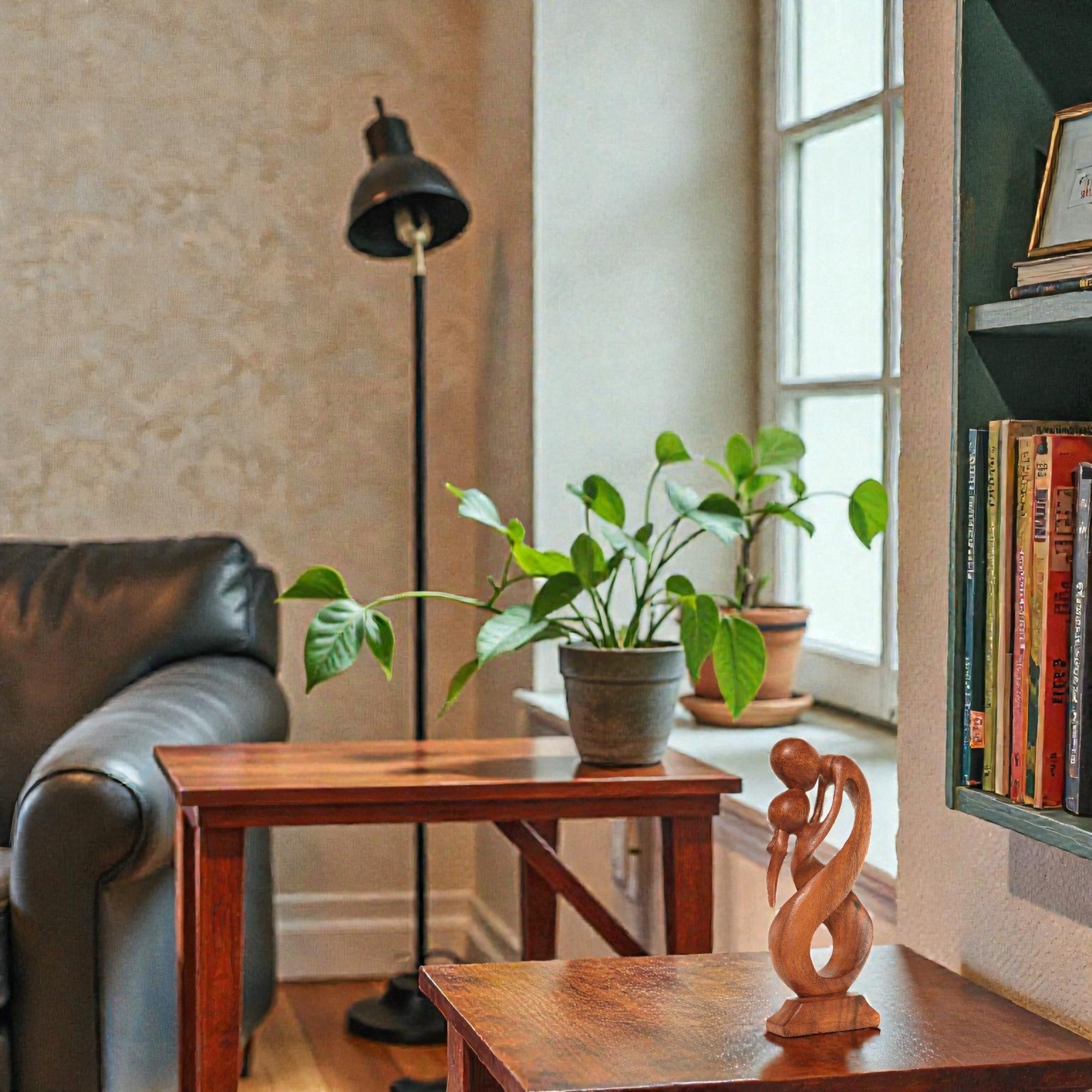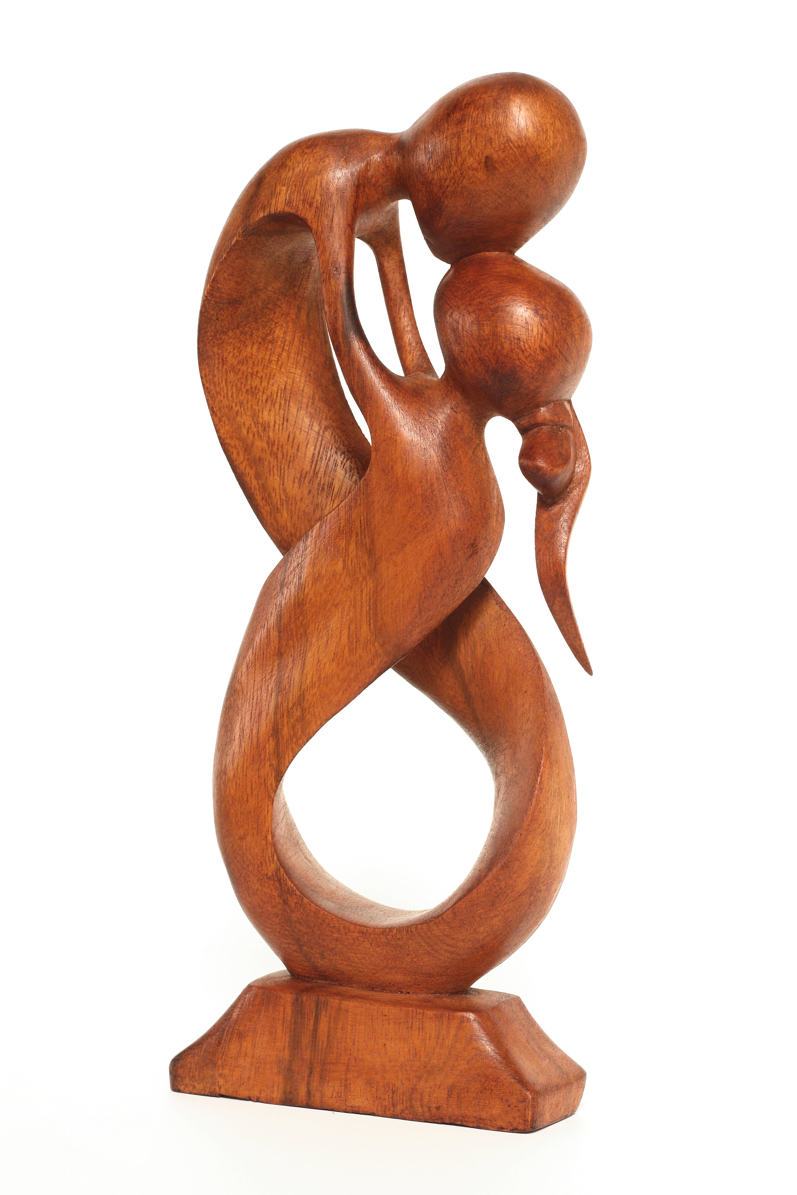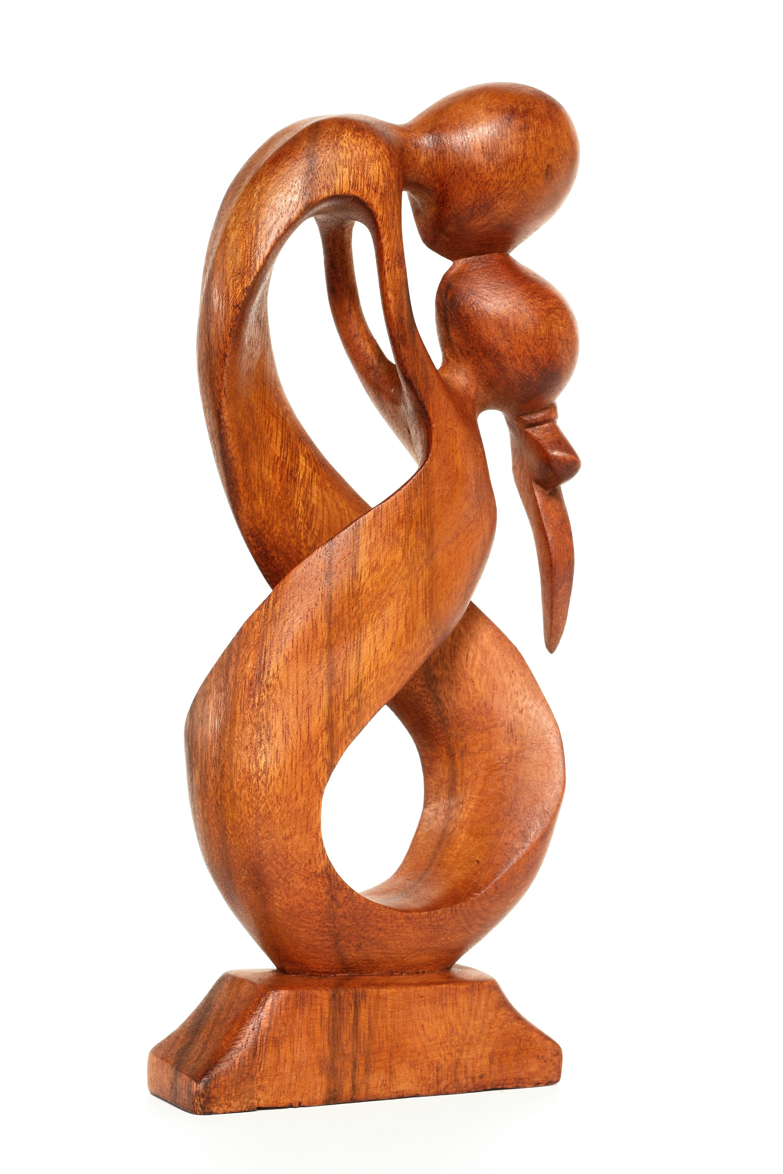Present this Wooden Hand Carved Abstract "Always Yours" to your sweetheart for an anniversary gift or "just because." It features a couple, carved as a figure eight, embracing each other, their faces locked in an eternal kiss. The woman's head features a dangling ponytail that ends in a point. This statue is carved into a small base that has a flat bottom and a slight scalloped edge to the top corners.