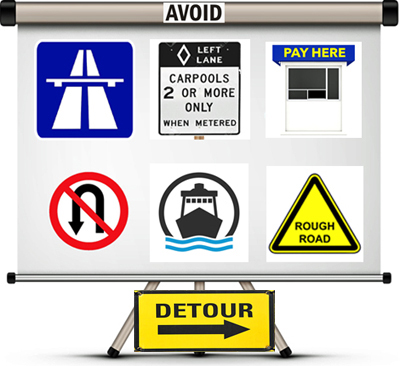 - AVOID USING MOTORWAYS, CAR SHARE LANES, TOLLS, U-TURNS, FERRIES and UNMADE ROADS.
