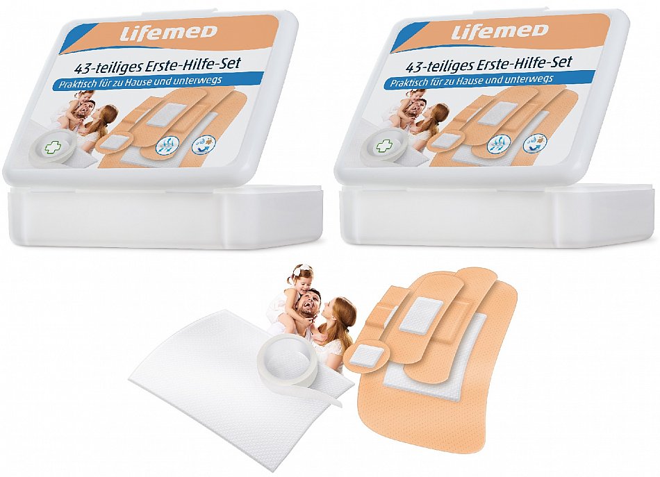 2 x Erste-Hilfe-Pflaster-Set, 43-teilig- praktisch für zu Hause und unterwegs- wiederverwendbare Kunstoffbox Inhalt:- 10x Durchmesser 25 mm, 10x 10 x 40 mm,10x 19 x 5 mm, 10x 19 x 72 mm, 1x 50 x 100 mm- 1 Heftpflaster auf Rolle- 1 Wundkompresse Hinweis:Wunde und umliegendes Hautareal sanft reinigen und vorsichtig trocknen. Ohne Dehnung anwenden. Kühl & trocken lagern. Anwendungsbeispiele:- eignen sich zur sicheren Wundversorgung für Groß und Klein- die Mikroporen des atmungsaktiven Trägermaterials sorgen für einen optimalen Austausch von Luft und Hautfeuchte- die Wundauflage verklebt nicht mit der Wunde