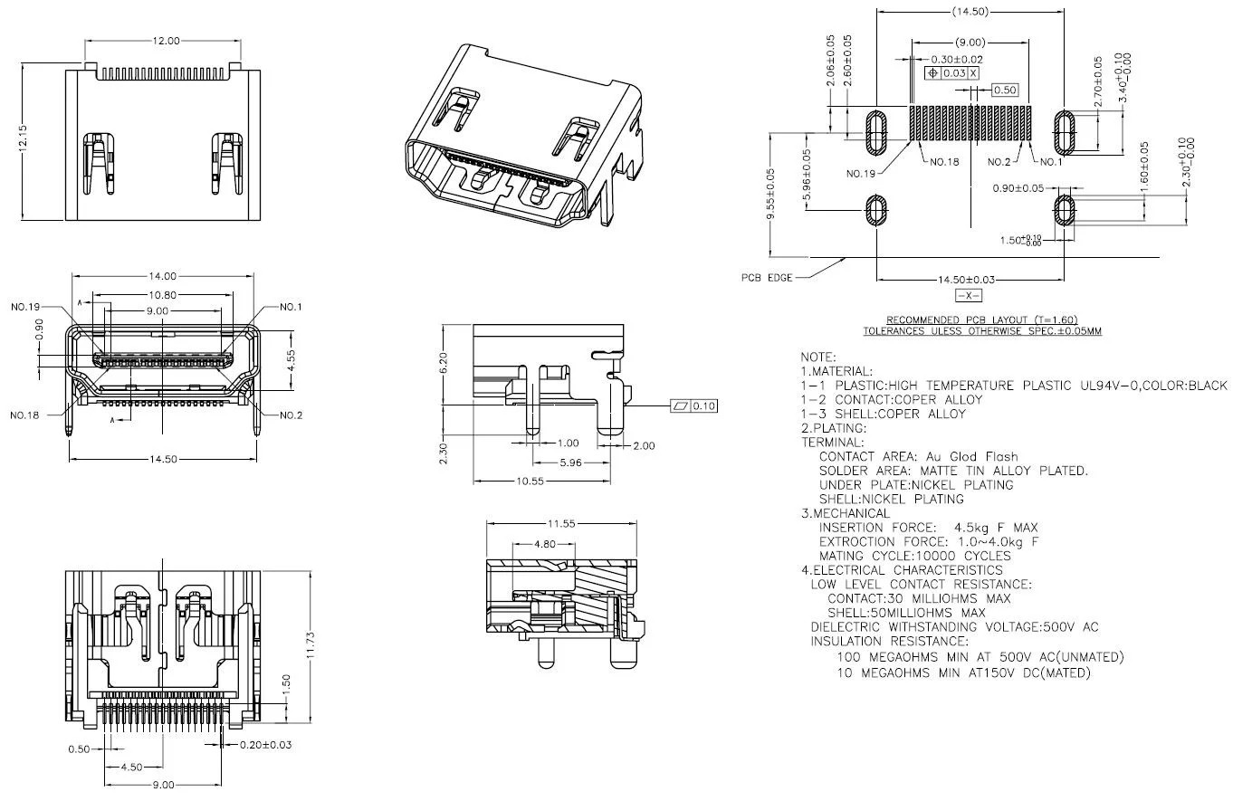 ![]() Type:HDMI Female 19Pin SMT Socket Contact resistance:≤30mΩ Insulation Resistance :≥100M Ω Withstand Voltage: AC 500V(50Hz)/min Operation Temperature Range: -20 to 85 degrees Material Plastic:LCP Shell:Brass Nickel-platedf Terminals:Brass |