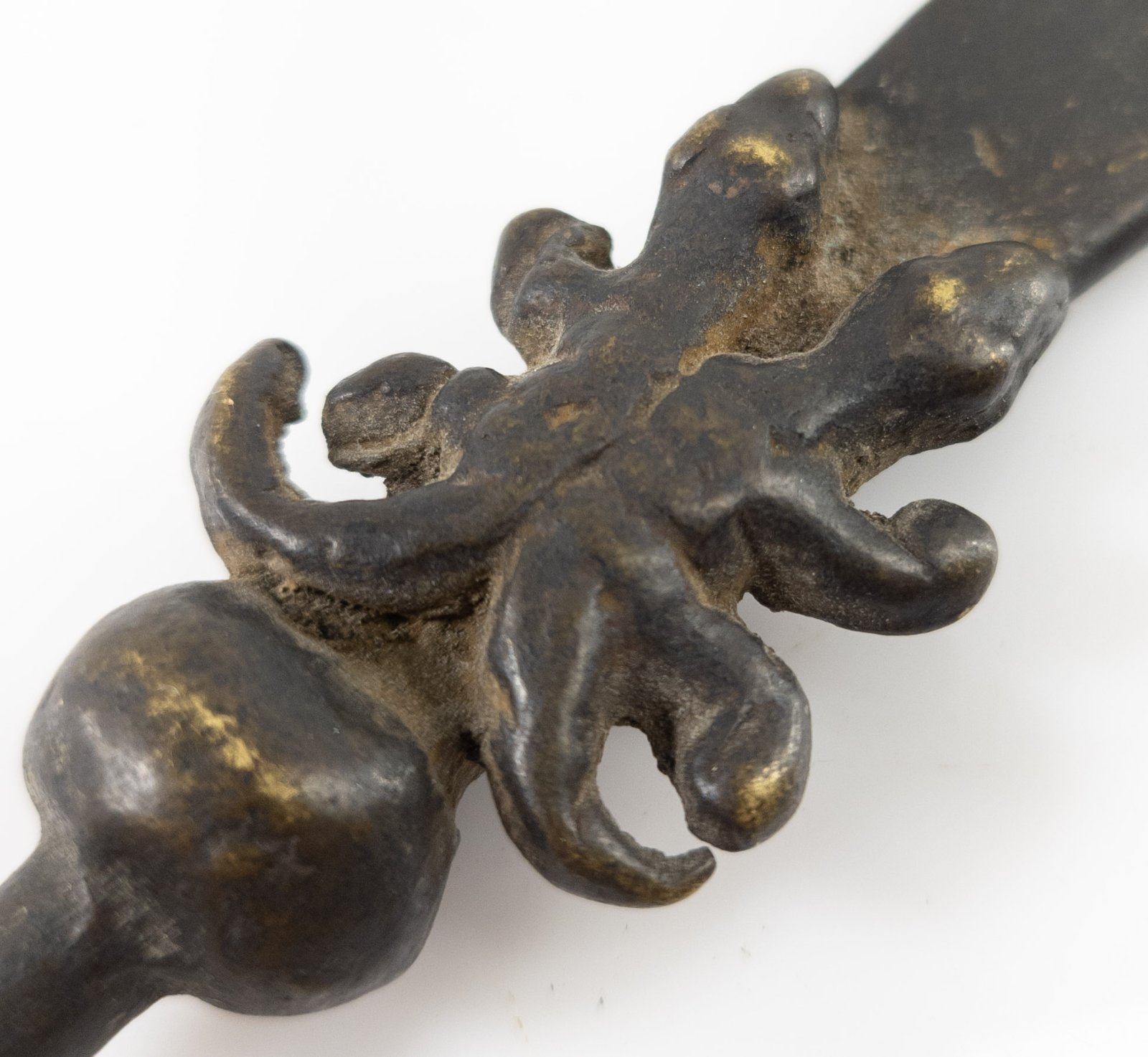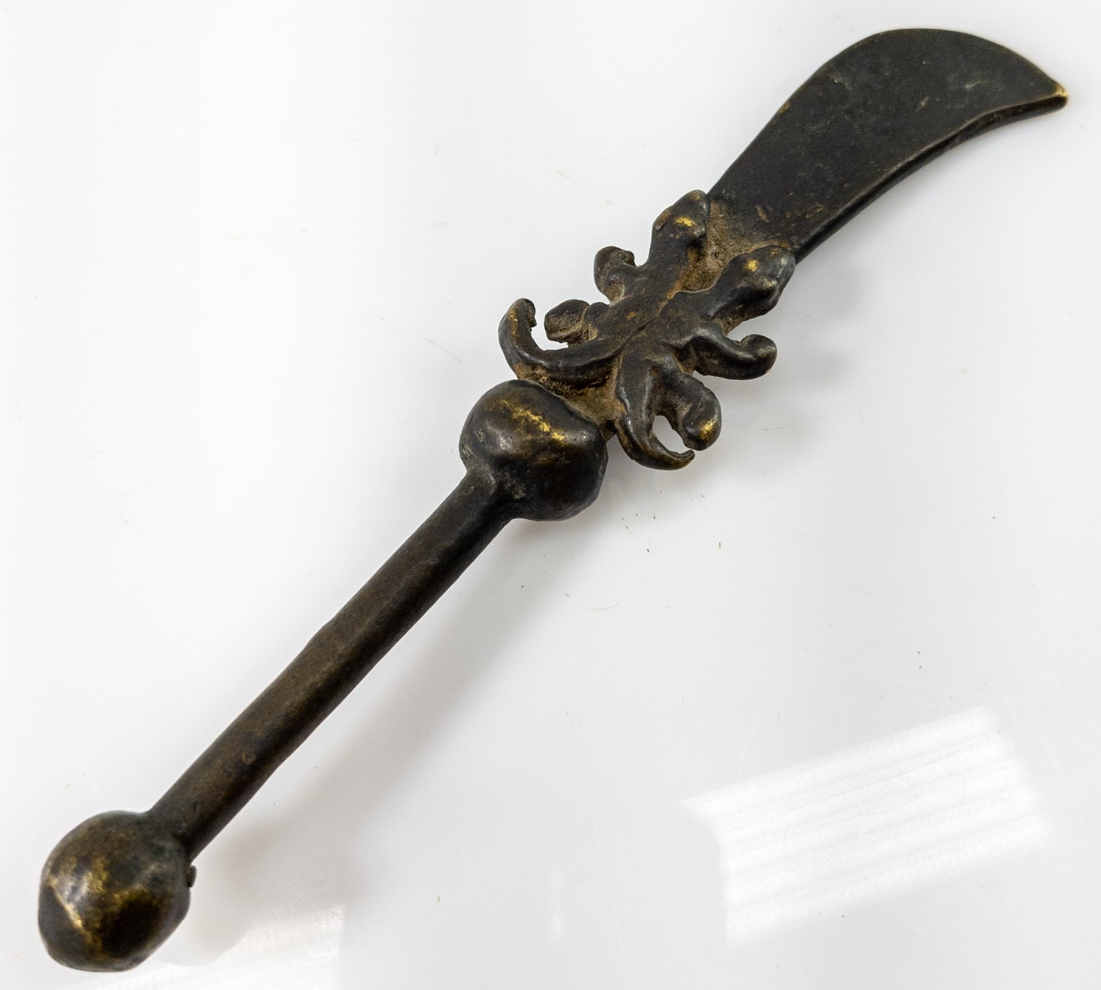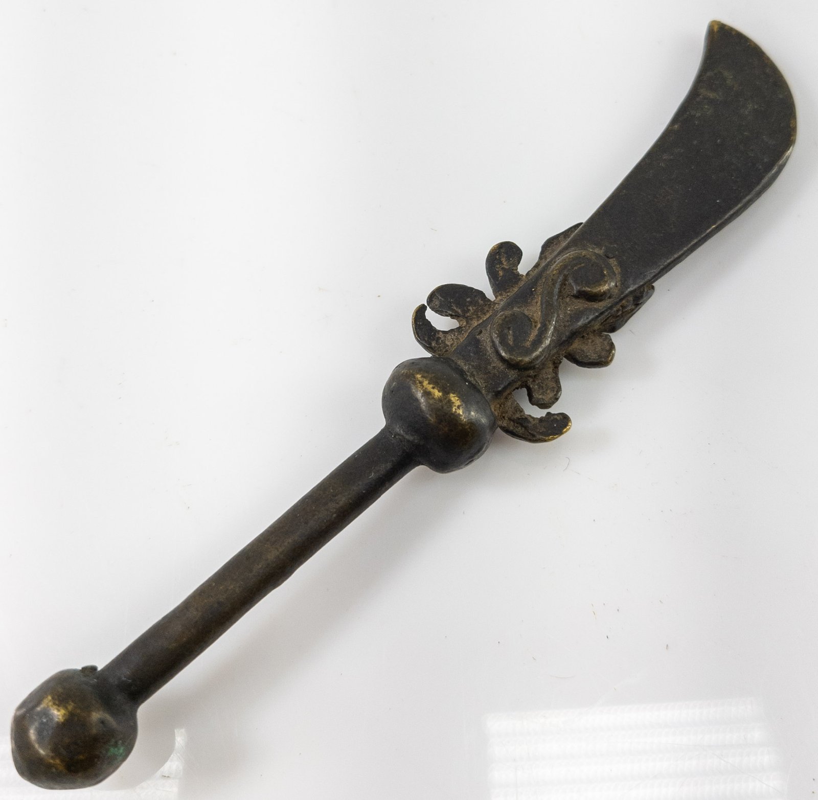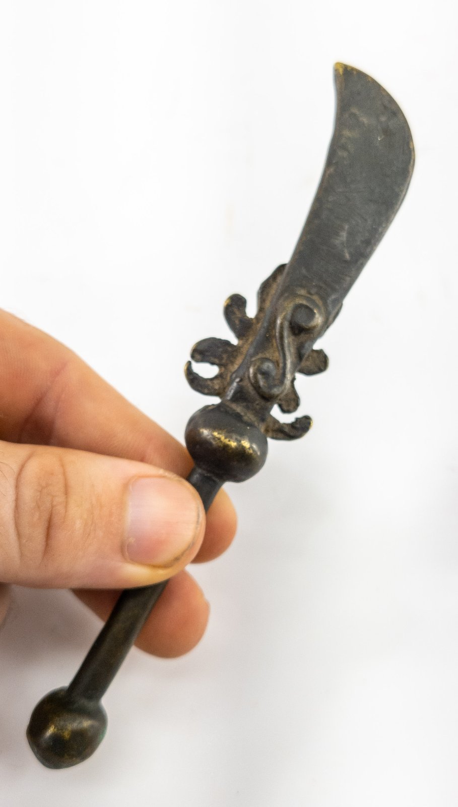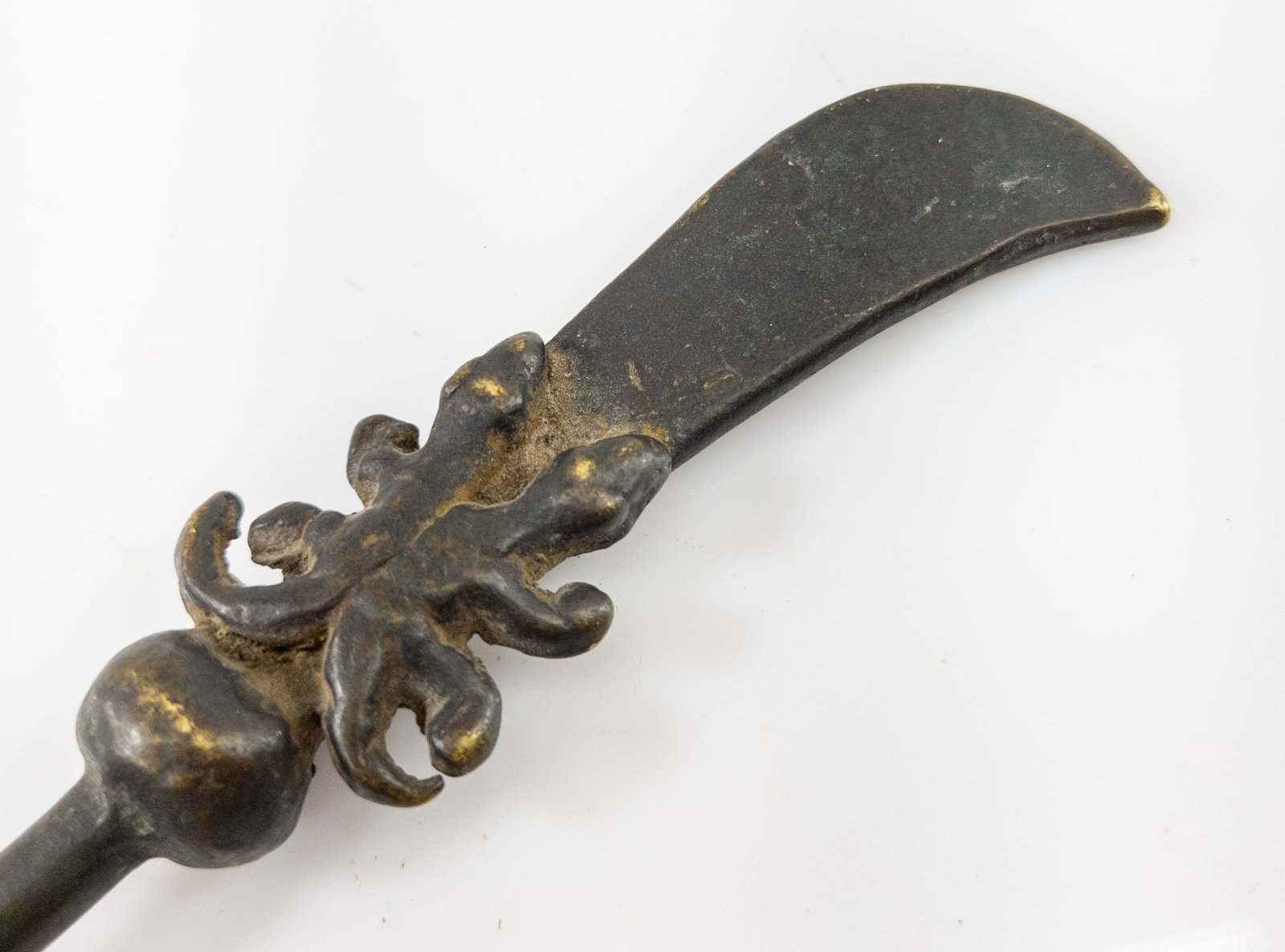 Antique Chinese Miniature bronze sword polearm weapon known as the Guandao or Reclining moon blade.