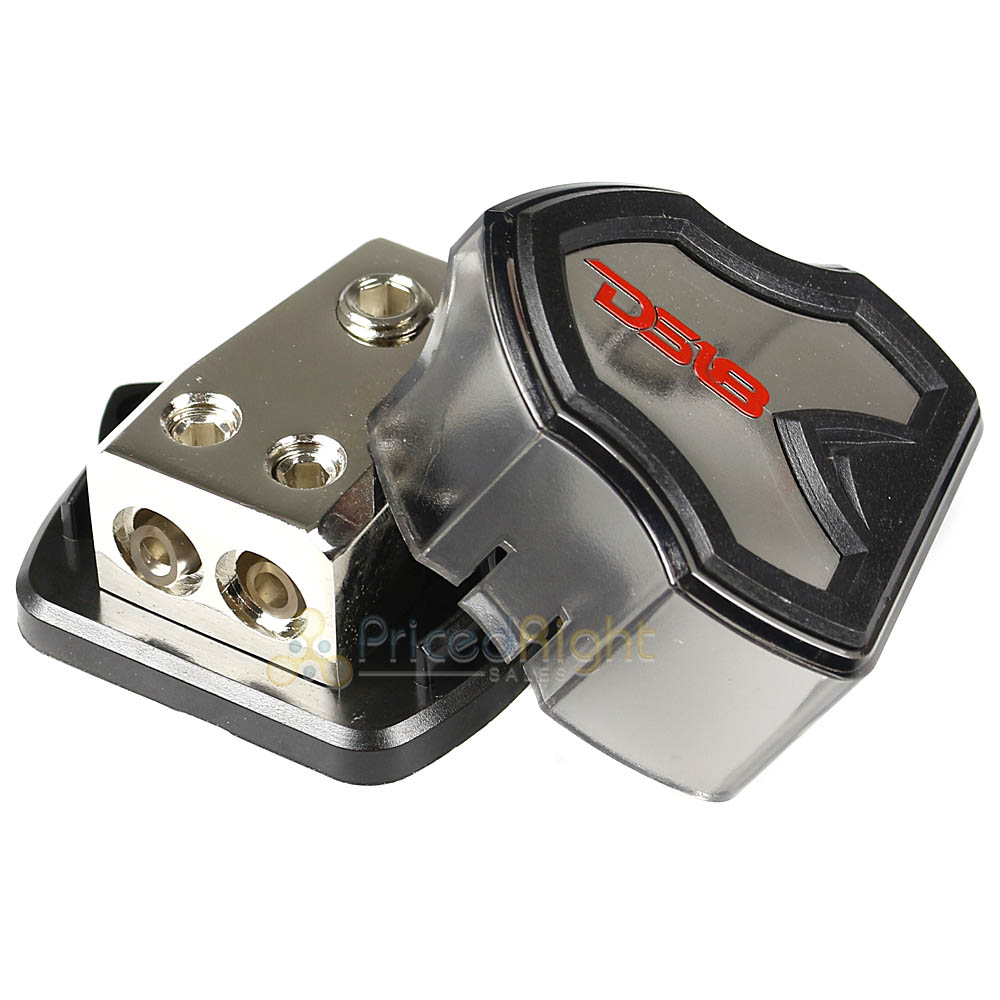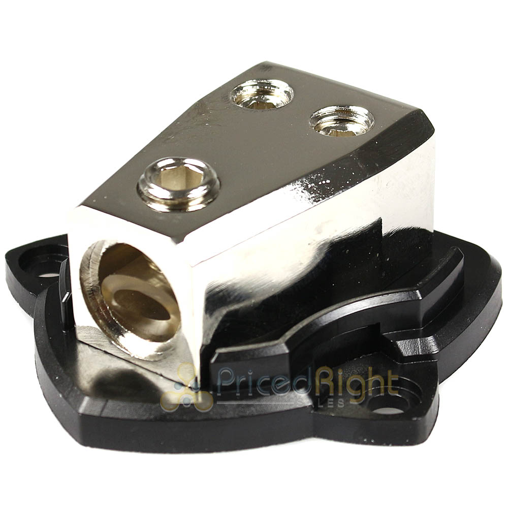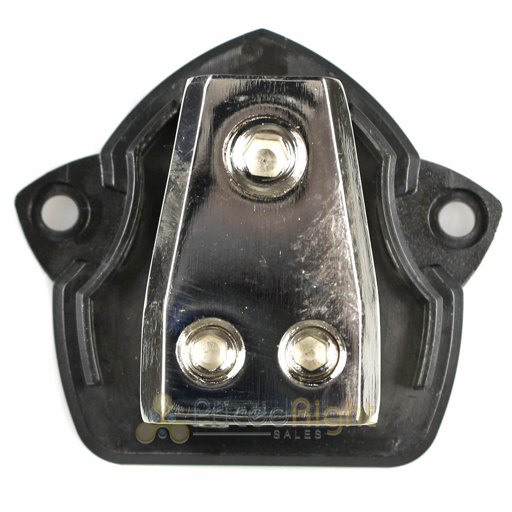 This distribution block is perfect for hooking up multiple components in your system. It has a 0 gauge input which it will then split into (two) 4 gauge outputs so that you can hook up all your components with ease. Perfect for use with power or ground wire eliminating the need to run several wires from the battery or drilling excess grounding spots in your vehicle.