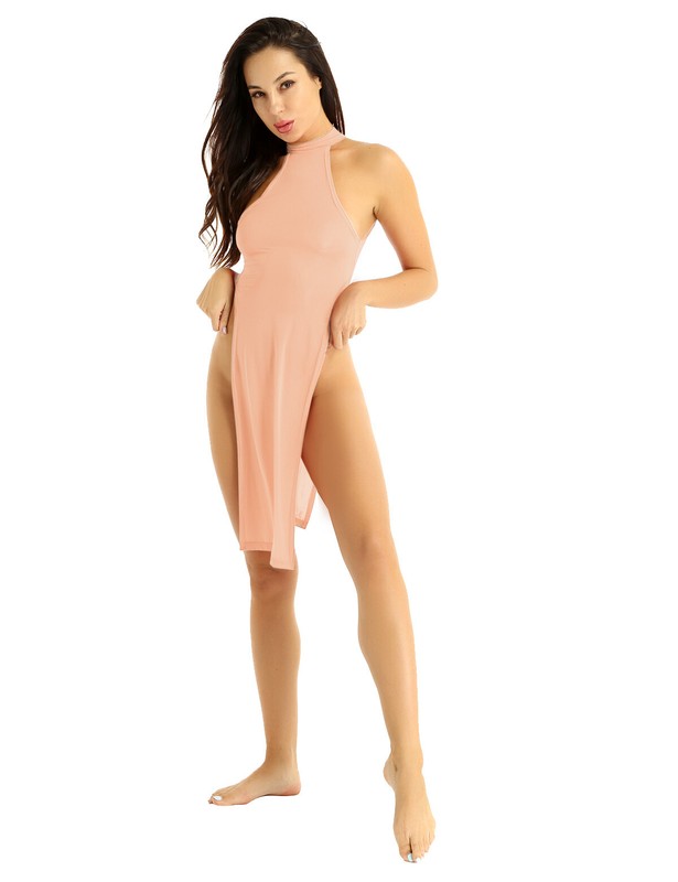 Halter neck with metal o-ring, sleeveless and backless, high slit leg and knee length, not see through.