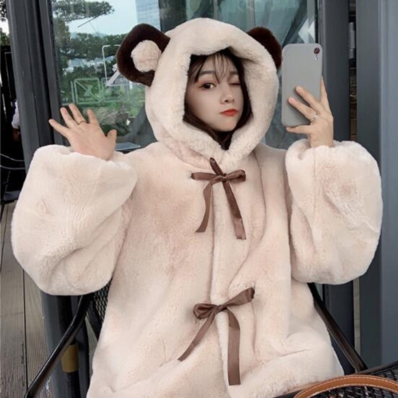 Lady Faux Fur Jacket Coat Hooded Fluffy Plush Bear Ear Warm Winter Cute Japanese