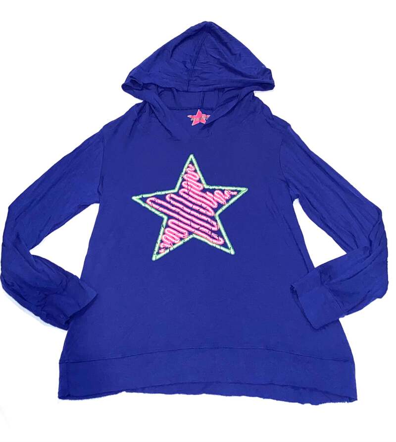 Hannah Sky girls slinky blue lightweight pullover hooded top with neon scribble star graphic size XL.