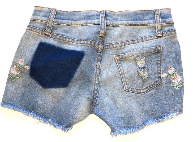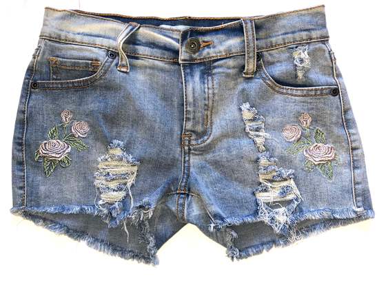 Vintage Havana girls light wash stretch denim shorts with destruction and embroidered roses size 12.