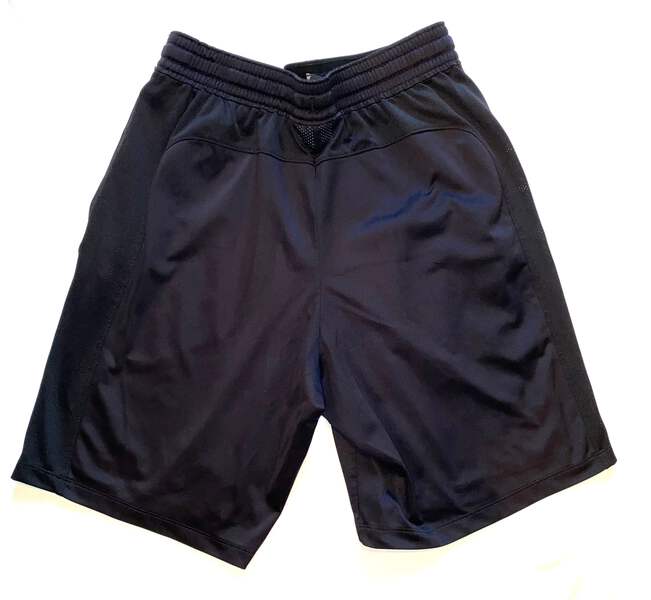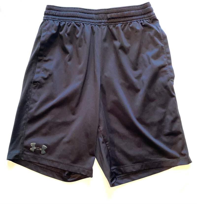 Under Armour men’s fitted black active shorts with raised black logo size S.