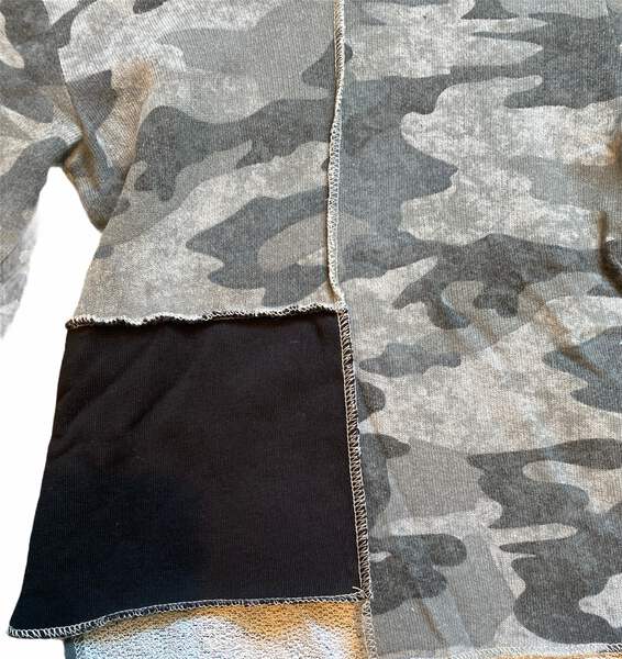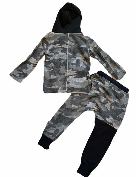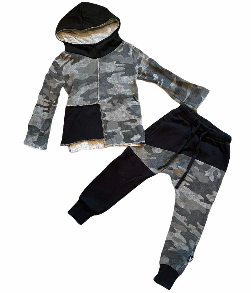Tuli Bert boys edgy 2pc raw edge asymmetrical hoodie & jogger set in black and gray camo colorblock size 3-4T.