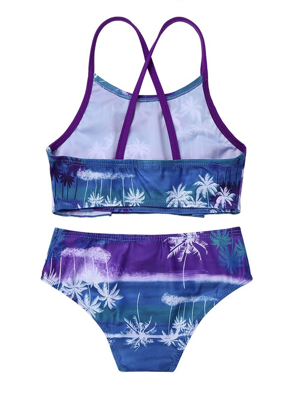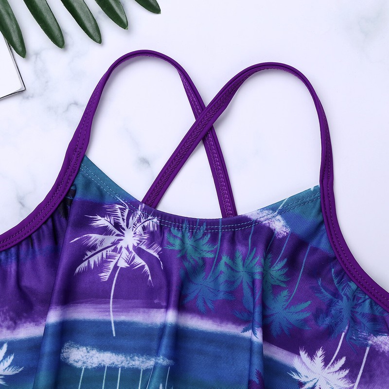 Spaghetti shoulder straps are criss-cross at back, flounce swim tops. Allover is printed with tropical palm pattern.