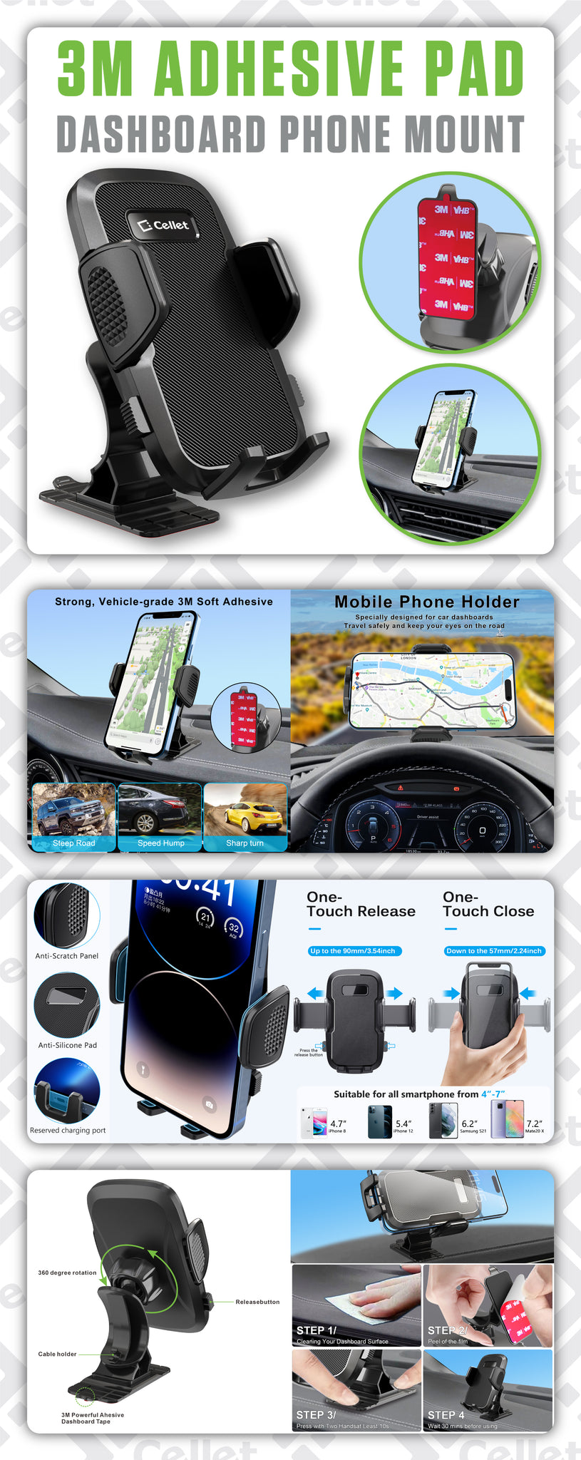Enjoy versatile phone mounting with the Cellet Universal Car & Desk Phone Mount. Featuring a powerful 3M adhesive pad, this mount securely attaches to your dashboard, windshield, desktop, or countertop, providing a stable and reliable hold for your smartphone. The 360-degree rotation lets you easily switch between portrait and landscape modes. With the one-touch release button, inserting and removing your phone is quick and effortless. This universal design is compatible with a wide range of smartphones, including iPhone, Samsung Galaxy, Google Pixel, and more. Ideal for navigation, hands-free calling, video calls, watching media, and keeping your device accessible at home, in the office, or on the road. Experience ultimate convenience with Cellet.