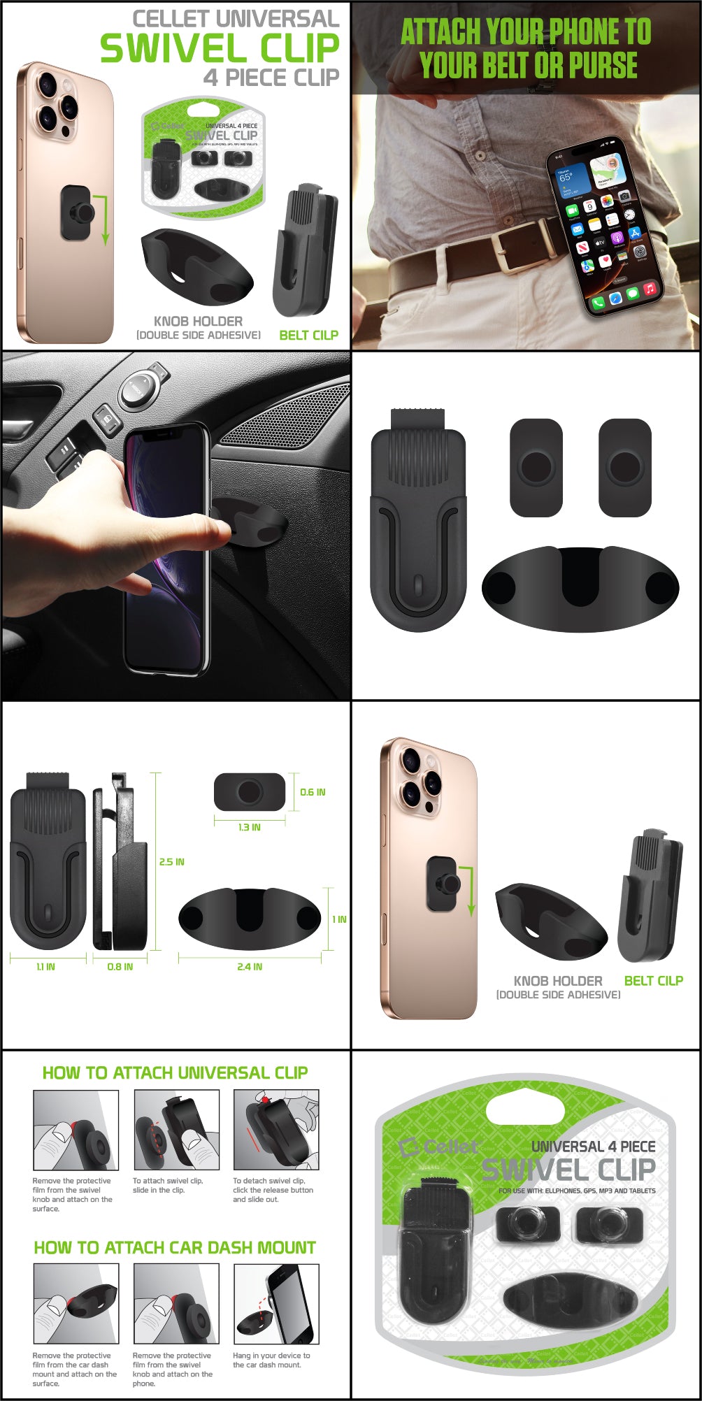 The Cellet Universal Swivel Clip Set makes it easy to keep your devices accessible and secure. Ideal for phones, walkie-talkies, and remotes, the kit includes a belt clip and a double-sided adhesive dashboard mount. Easily rotate your device with the swivel base and use the quick-release button for fast detachment. Whether you’re at work, driving, or hiking, this 4-piece set has everything you need to stay hands-free.