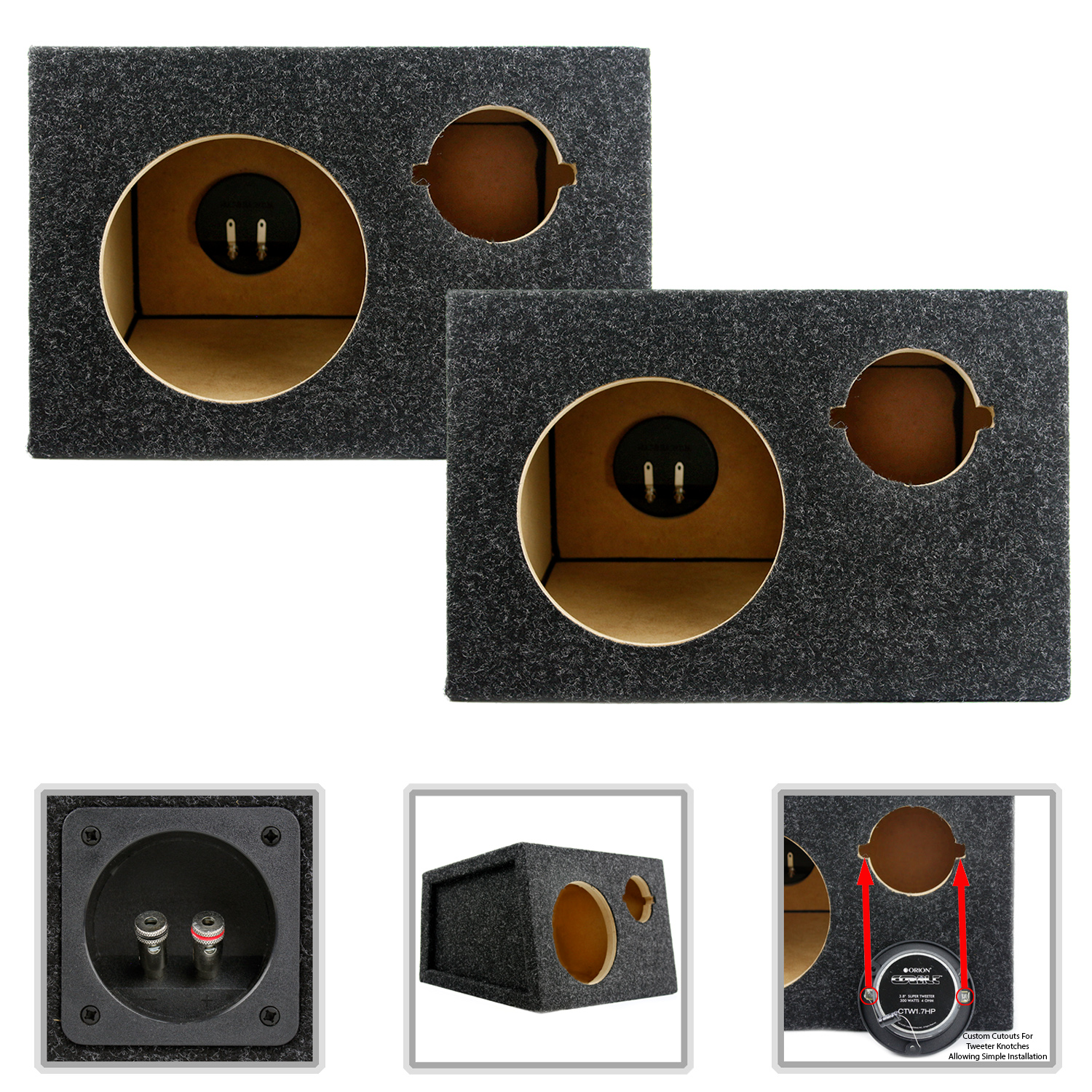 These beautiful 6.5" speaker boxes were custom-designed to provide top-quality enclosures for any mid-range speaker and tweeter combination. With a premium felt carpet all-around finish, these two speaker boxes are a perfect addition to your audio lineup. Each of the left and right custom enclosures has openings for both a 6 or 6.5" mid-range speaker as well as a 3" tweeter with cutout notches on either side for installation simplicity.