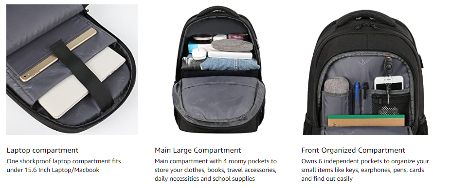 backpack. One separate laptop compartment hold 15.6 Inch Laptop or less. One