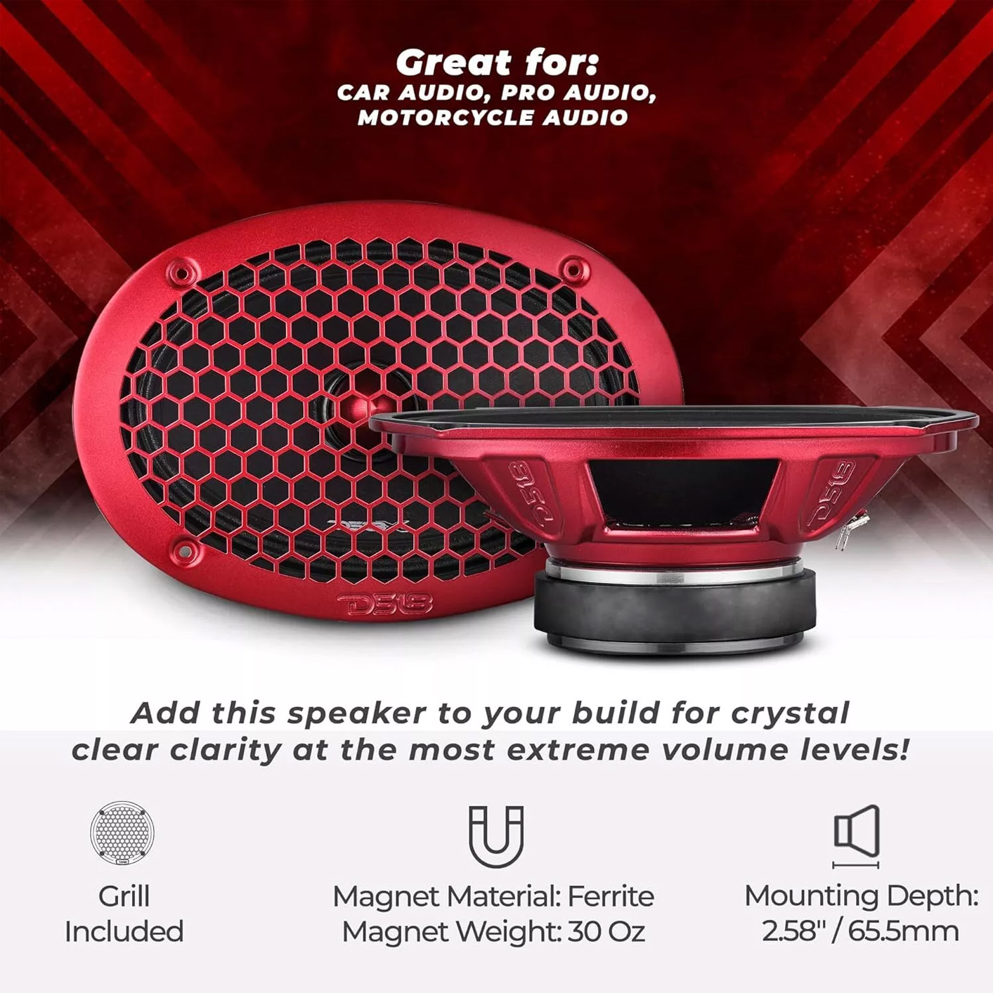 Get the most out of your system by upgrading to these speakers that give you everything you're missing from your stock stereo with this DS18 6 x 9" Midrange Loudspeaker which sounds great with instrumentals and even better with vocals. This mid-range driver can answer the call to handle the most significant part of sound with its bullet dust cover that is designed to protect the voice coil and provide optimal audio each and every time. The PRO-X694BM delivers an impressive 400W Max Power with 200W RMS at 4 Ohms, enough to tackle a full range of audio. Its 1.5” high-temperature CCAW voice coil can handle extreme heat and maintain its structural integrity meaning long life out of your speakers. Settle for nothing but the best with a high-strength 27oz ferrite magnet that produces a wider range of tones and can handle tremendous power at high volumes. Discover what a true midrange speaker can do for you!