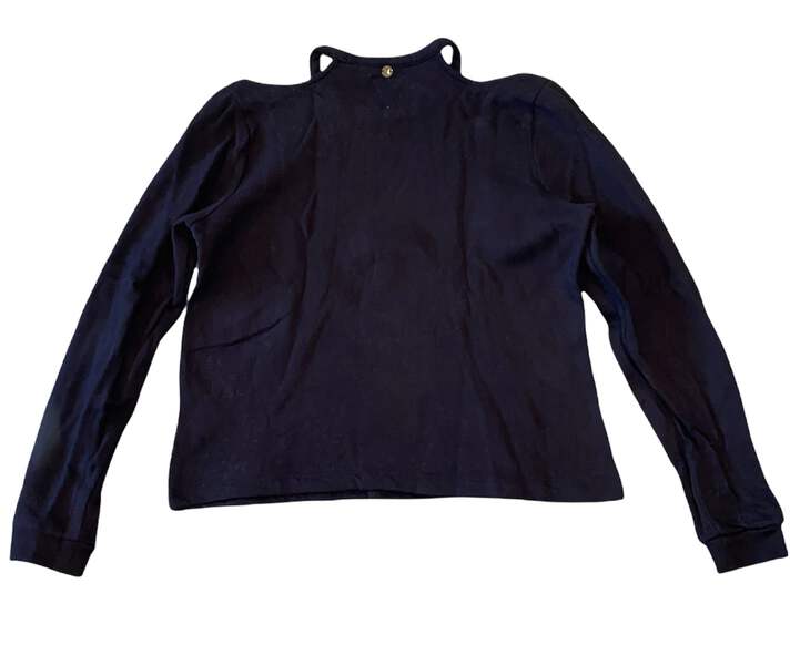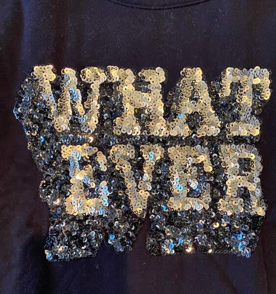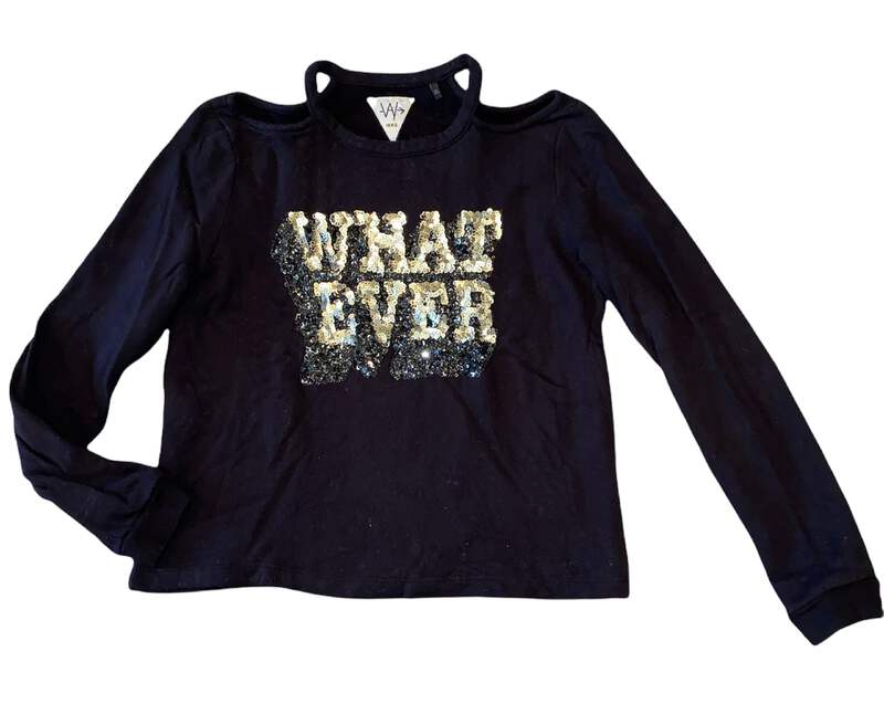 kks girls cozy black cold shoulder sweatshirt with WHATEVER in silver sequins size XS(12).