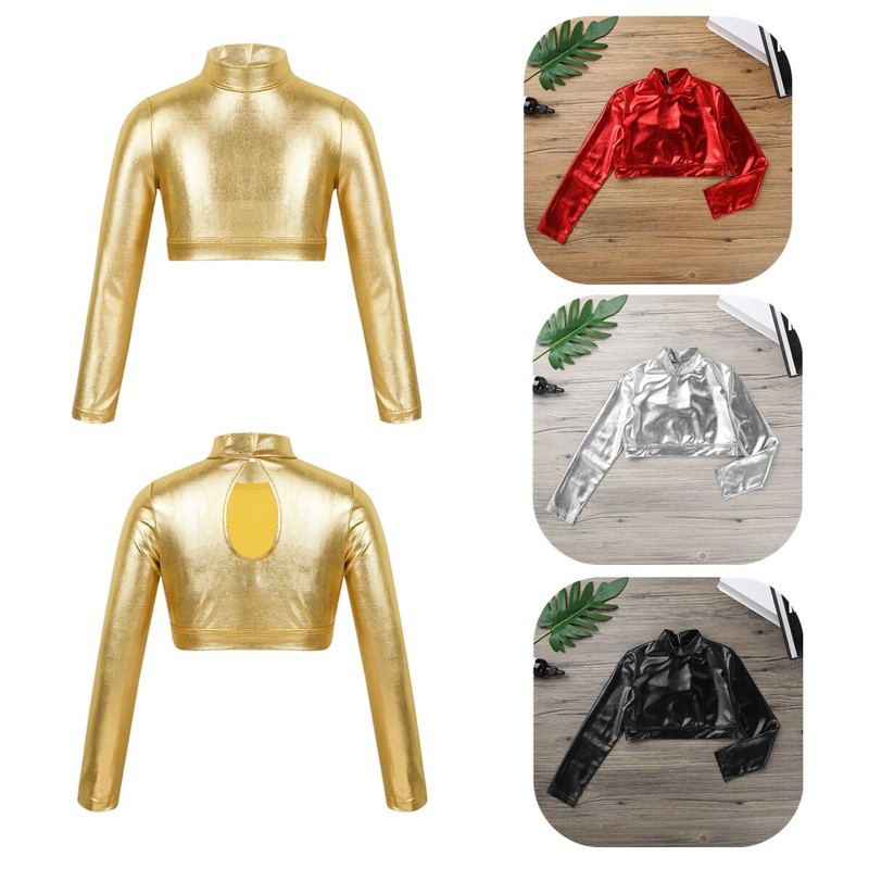 Long sleeves, mock neck with hook and loop fastening, keyhole back. Glossy appearance.