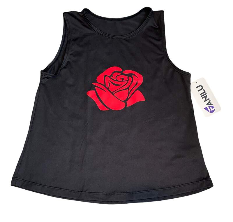 Fanilu girls shiny poly black muscle tank with red roses on front size 6.