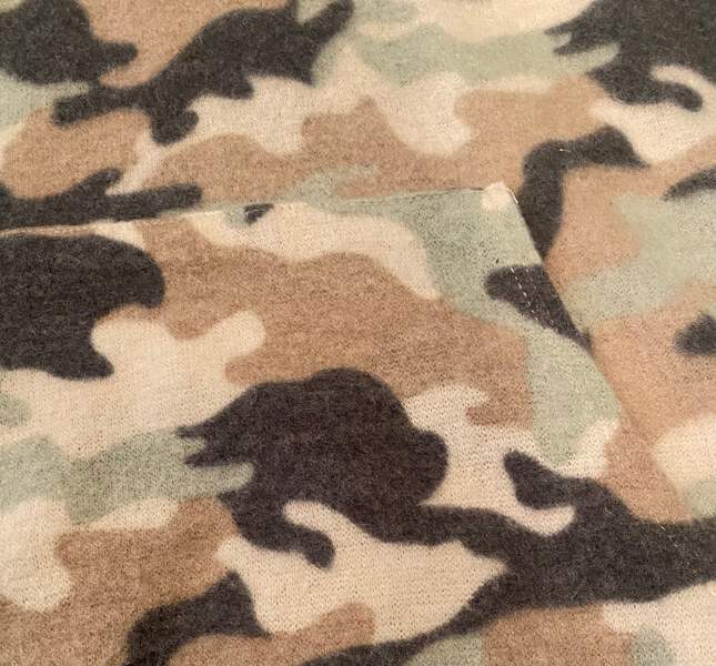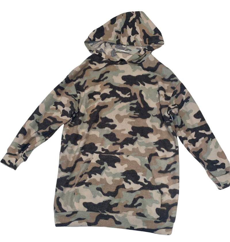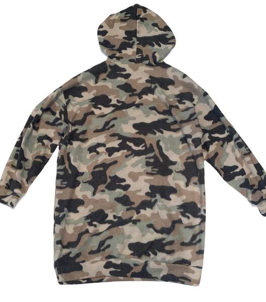Lush women’s super soft cozy knit hooded tunic sweater in taupe multi camouflage, size S.