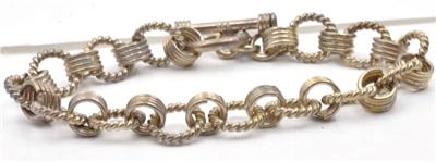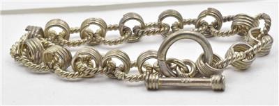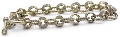 This is a nice ready to wear, near mint condition, ladies bracelet, with round cable links, alternating with charm style links. The larger round cable links, are 11mm in diameter. This could definitely be a charm bracelet. The wrist size, is 7 & 1/2", and this is ready to wear, and all original. It weighs a very solid 22.5 grams. It is stamped 925, on the bar end.
