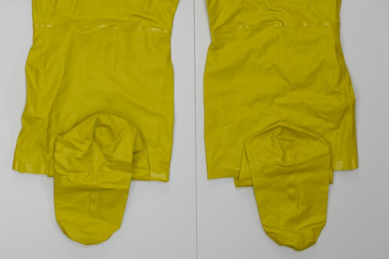 The zipper is welded to the suit, closes downwards and is protected by a splash guard (flap).